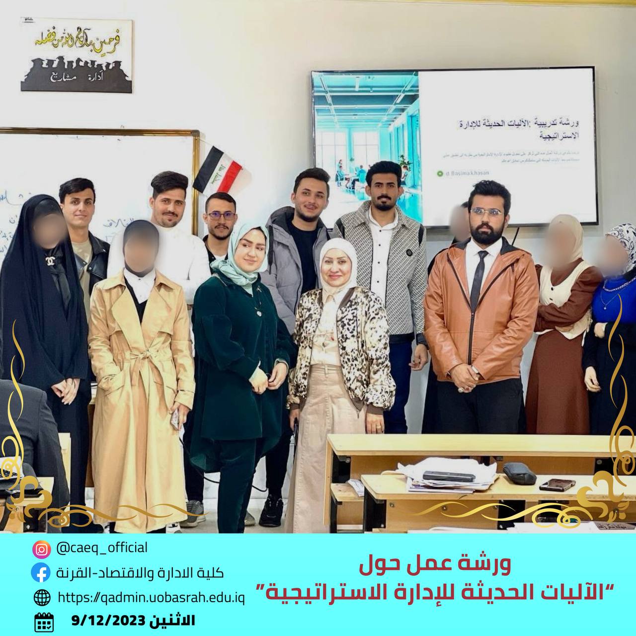 The University of Basra organized a workshop titled "Modern Mechanisms of Strategic Management," held by the College of Administration and Economics – Qurna, Department of Project Management, for the fourth-year students. The workshop was supervised by Assoc. Prof. Basma Kazzar Hassan and Dr. Wesan Hadi Faihan. It focused on transforming the concept of strategic management from a theoretical framework to practical application, exploring modern mechanisms to achieve organizational goals.