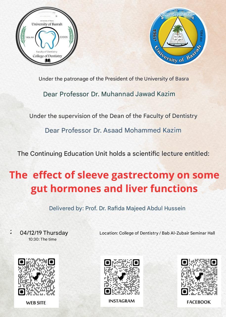 The College of Dentistry, in cooperation with the Continuing Education Unit, will hold a scientific lecture entitled (The effect of sleeve gastrectomy on some gut hormones and liver functions).