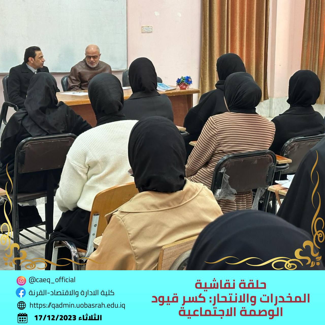 The College of Administration and Economics - Qurna / Department of Finance and Investment at Basra University organized a panel discussion titled “Drugs and Suicide: Breaking the Chains of Social Stigma” on Tuesday, December 17, 2024. The session was led by Assistant Professor Dr. Zahid Qasim Badhan (Head of the Department of Finance and Investment) and Dr. Jabbar Atiya.