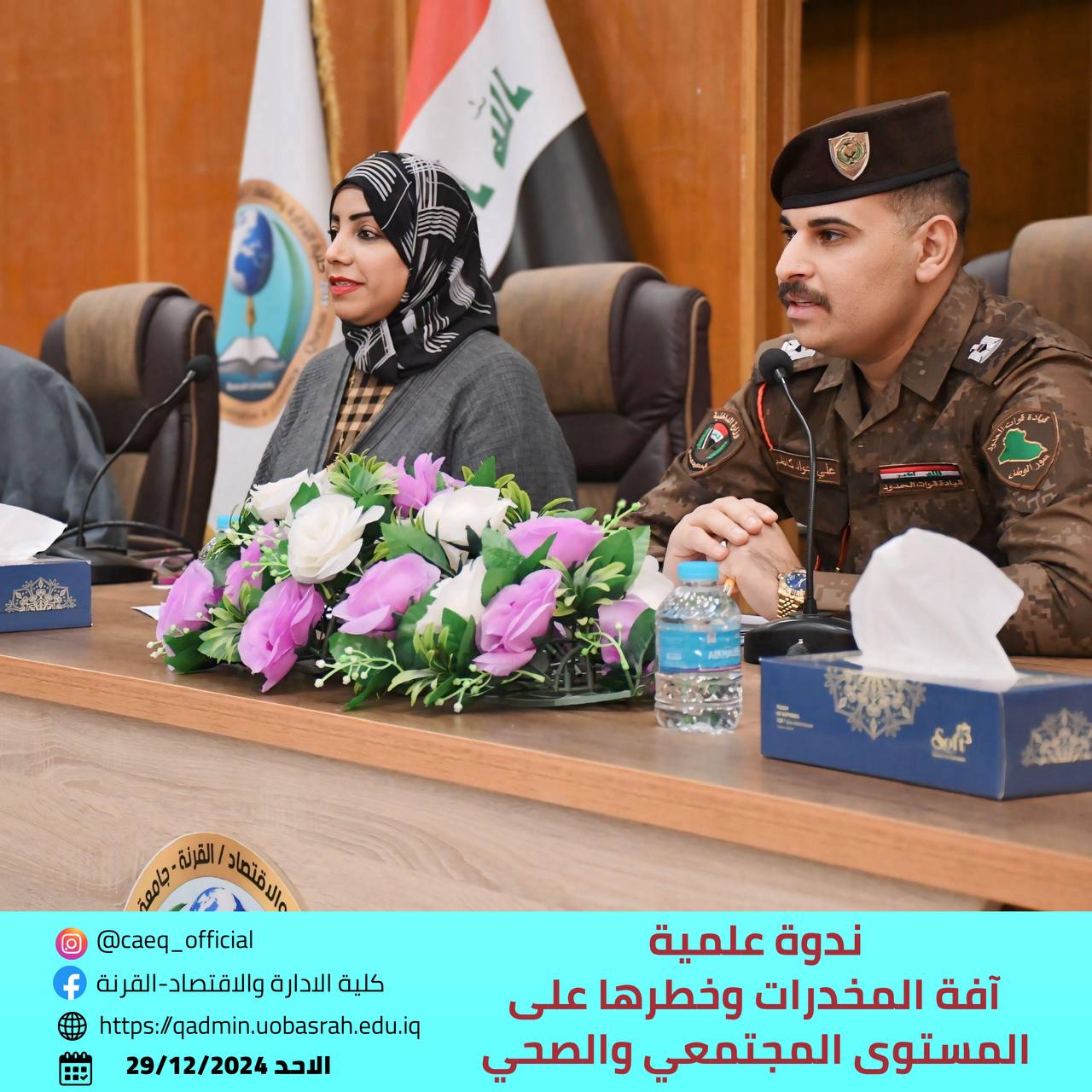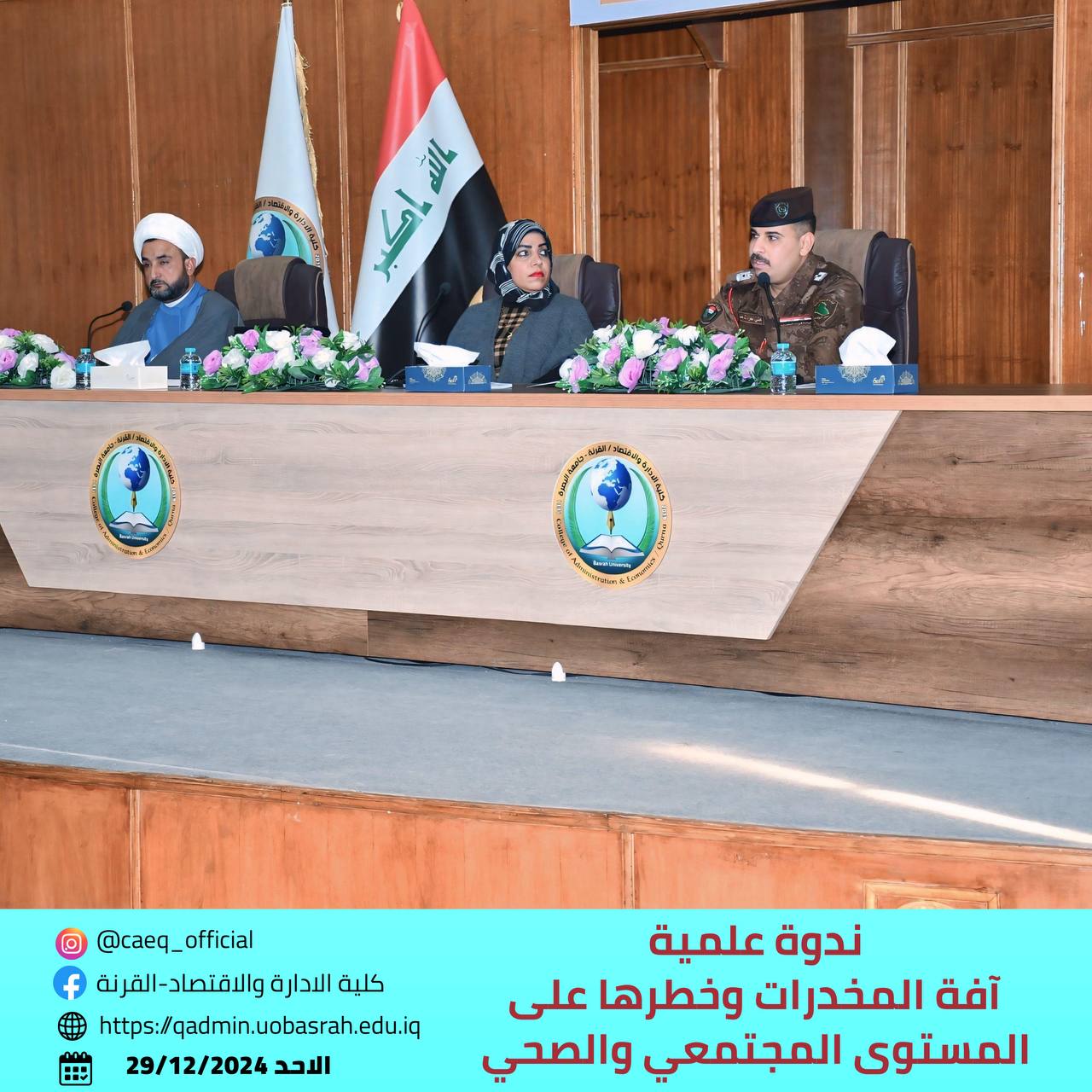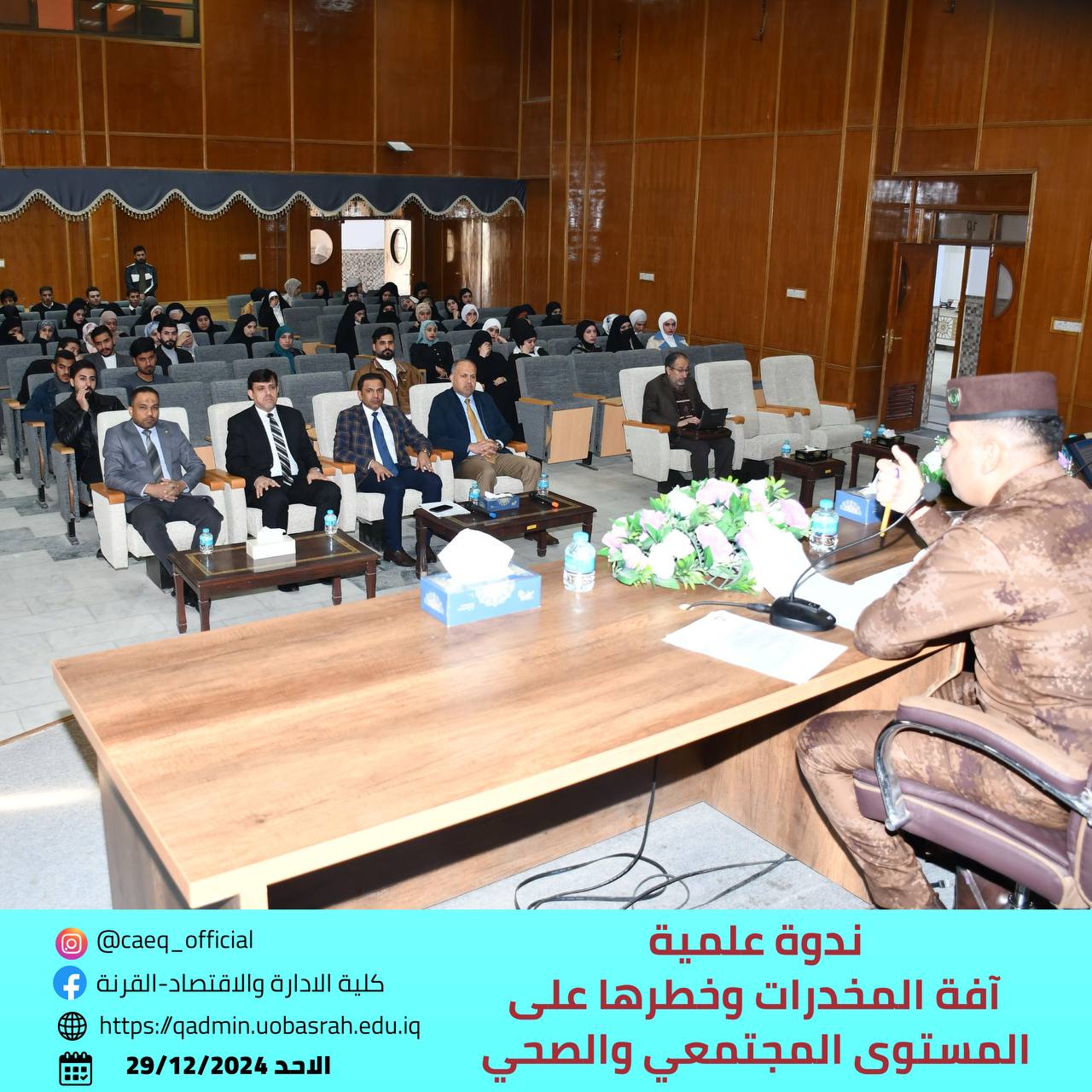 The College of Administration and Economics - Qurna at the University of Basrah organized a scientific seminar titled "The Drug Epidemic and Its Risks on Societal and Health Levels" on Sunday, December 29, 2024, in collaboration with the Continuing Education Unit and the Psychological Counseling and Educational Guidance Unit.