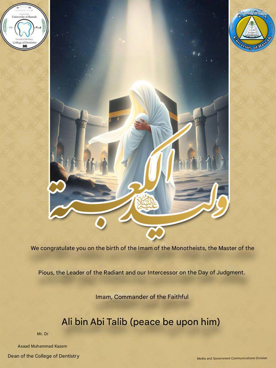 Congratulations from the Deanship of the College of Dentistry on the occasion of the birth of Imam Ali bin Abi Talib, peace be upon him