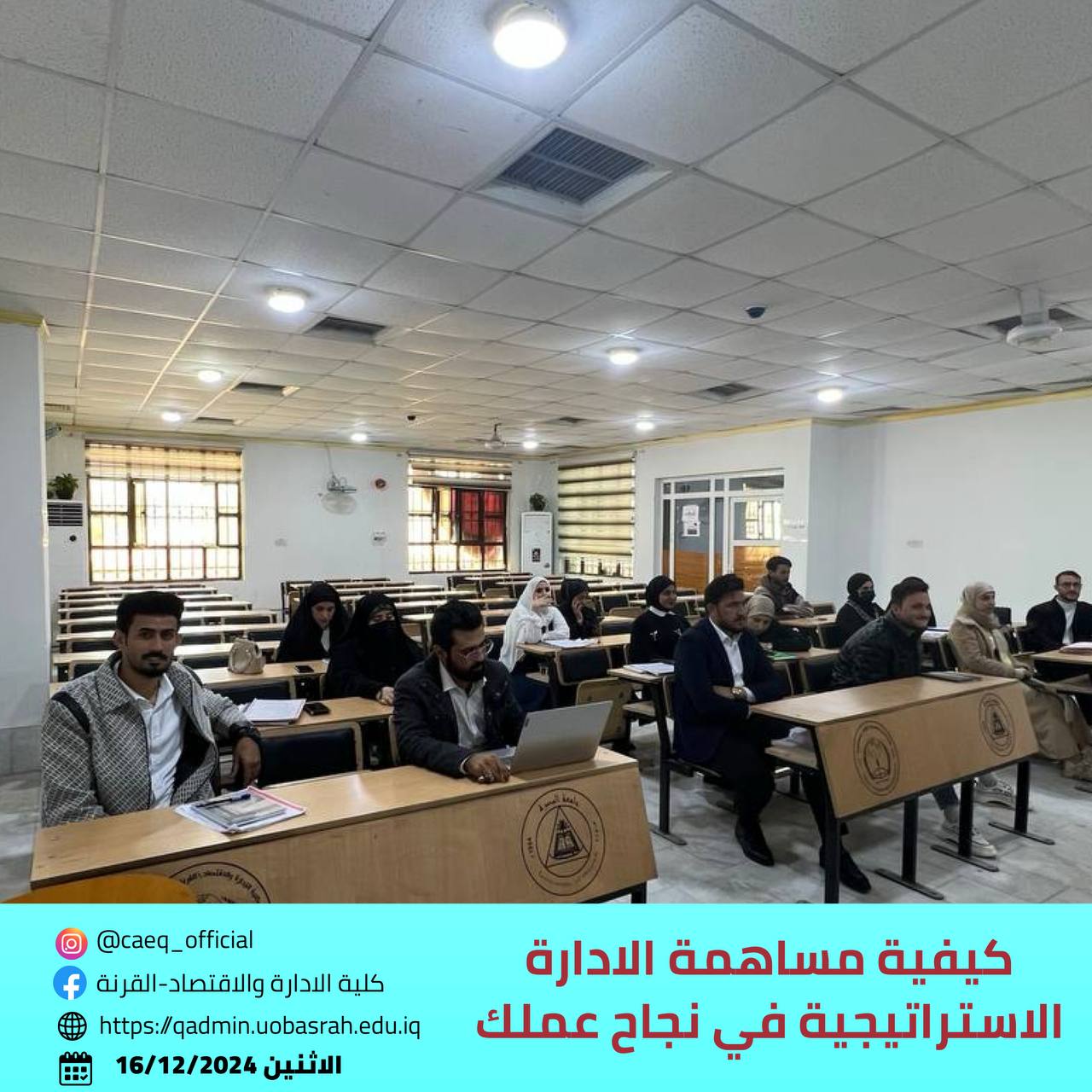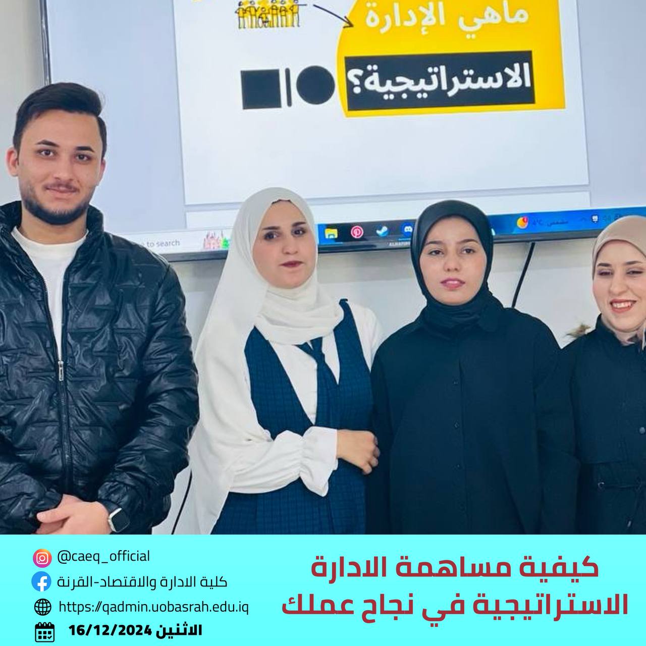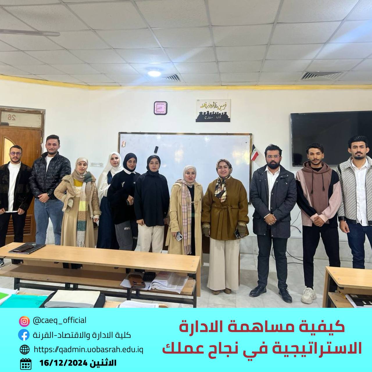 The College of Administration and Economics - Qurna, Department of Project Management at the University of Basrah, organized a workshop titled "How Strategic Management Contributes to Your Business Success." The workshop targeted fourth-year students in the department and focused on enhancing participants' understanding of different organizational strategies and their role in achieving institutional success.
