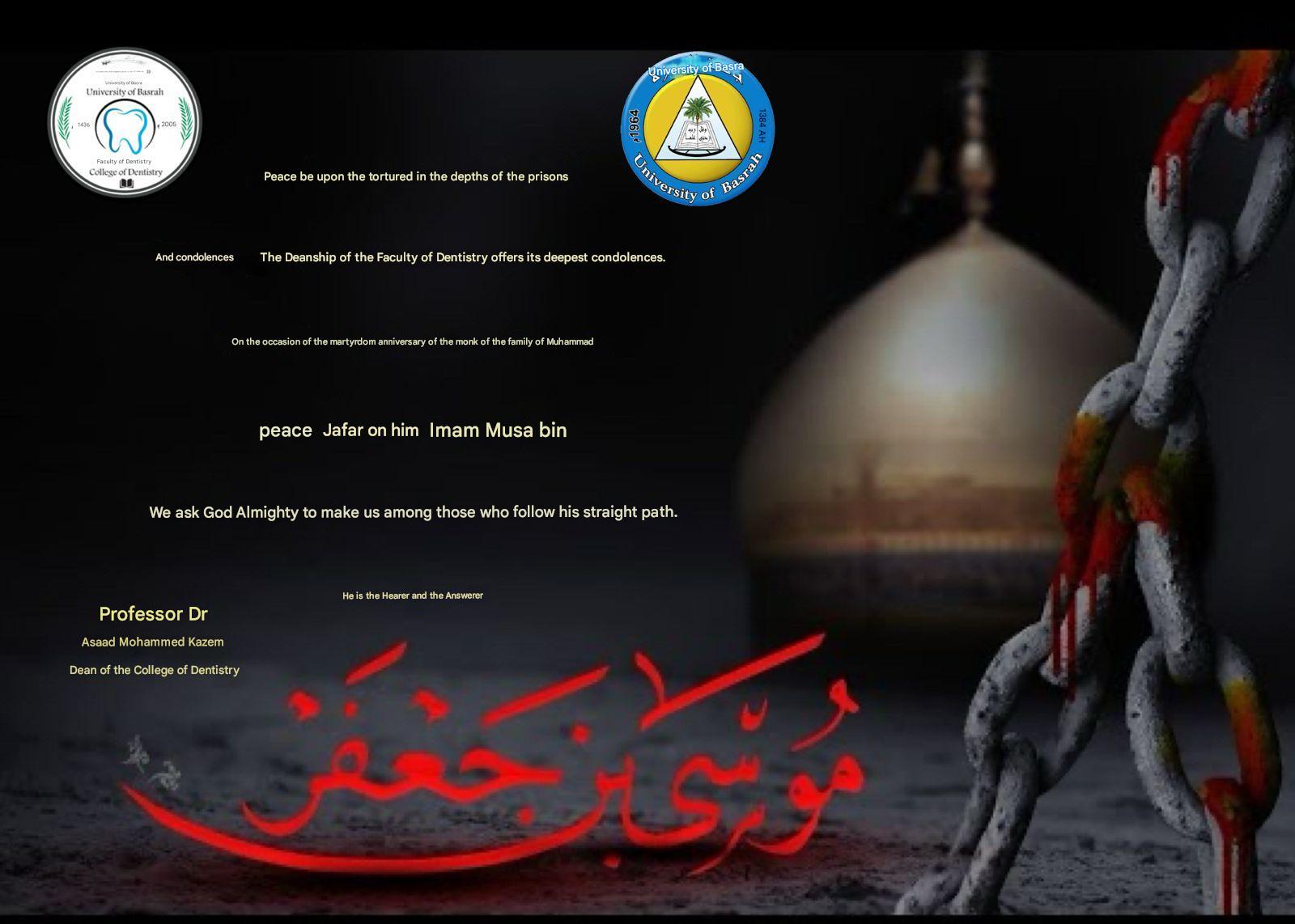 Condolences of the Deanship of the College of Dentistry on the occasion of the martyrdom anniversary of Imam (Musa bin Jaafar), peace be upon him