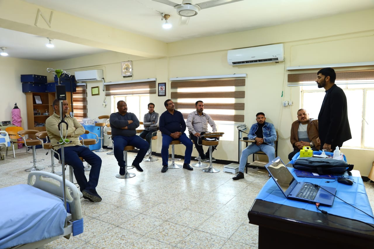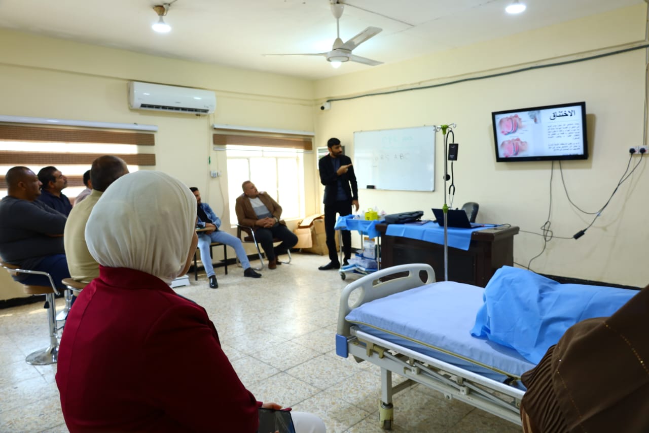 The College of Nursing at the University of Basra, in cooperation with the Continuing Education Center at the University of Basra, organized a workshop on “Basics of First Aid for Choking and Loss of Consciousness, Burns and Severe Wounds”, which was lectured by Lecturer Ali Malik, a faculty member, and the target group was employees of the University of Basra.The workshop also included a number of topics, including the importance of training in first aid. The workshop dealt with several topics in a theoretical and practical manner, such as cardiopulmonary resuscitation, first aid for choking, wounds and burns, how to save the patient, protect the paramedic while providing assistance, and avoid complications until the medical team arrives and the injured person is transferred to the hospital. The attendees participated in the practical training and expressed their happiness with the ease of first aid, which was previously a barrier of fear that prevented providing assistance to others.The workshop aimed to learn the basic principles of first aid and how to deal with the injured using the simplest available means to save the injured person's life and avoid complications of the injury. The lecturers called for the necessity of urging employees and students to participate in first aid courses to be trained to provide assistance to the injured and how to deal with each case and avoid complications that lead to the death of the injured person or permanent disability until the medical team arrives.