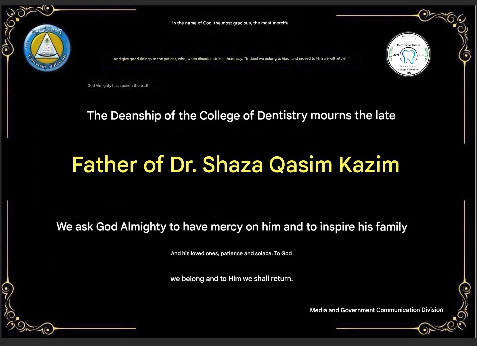 The Deanship of the College of Dentistry offers its condolences to Dr. Shaza Qasim on the death of her father.