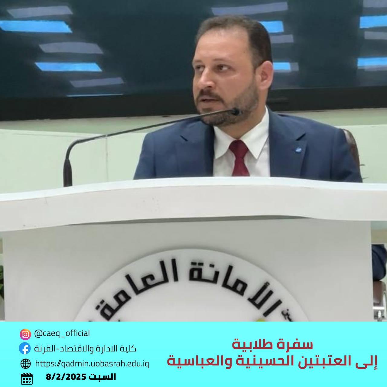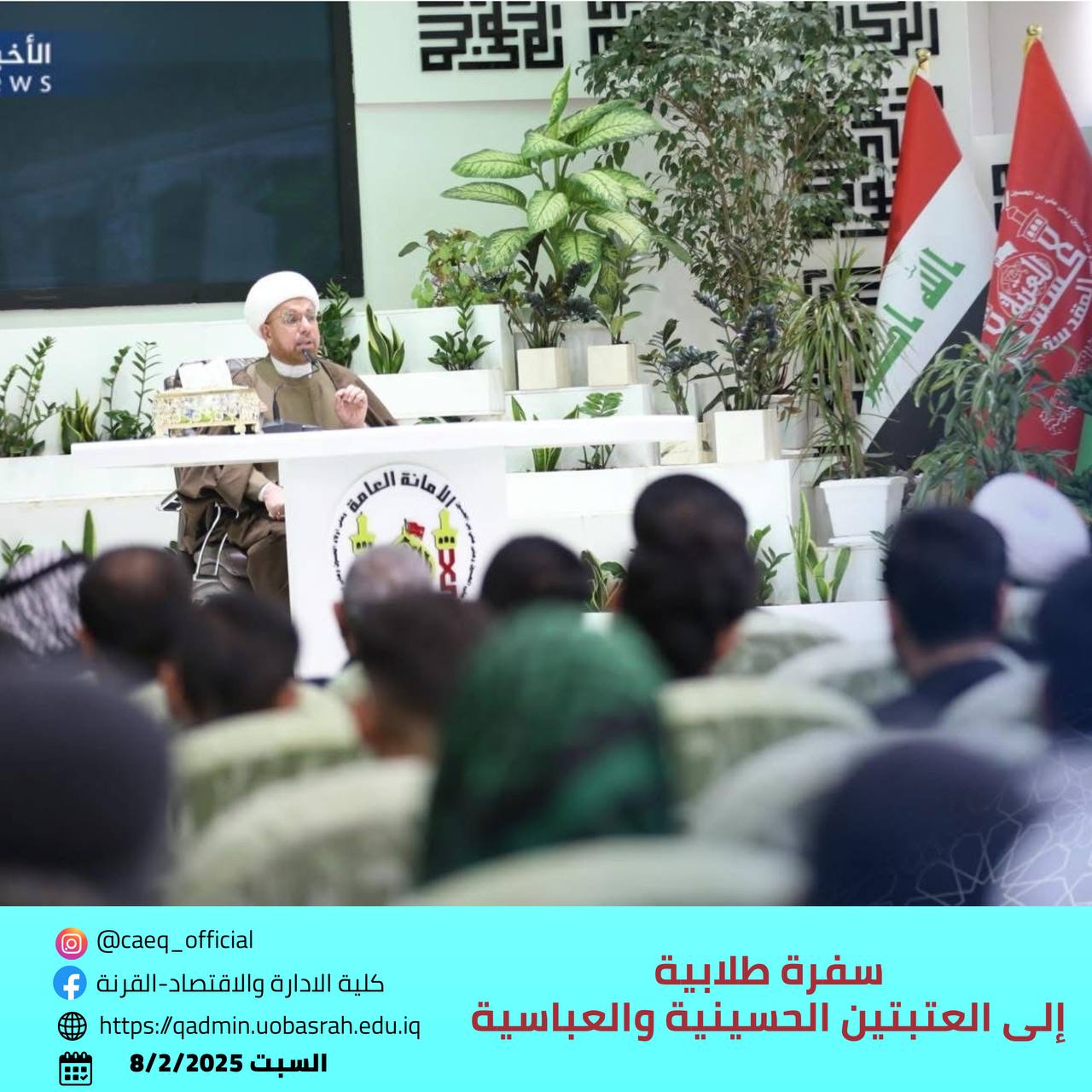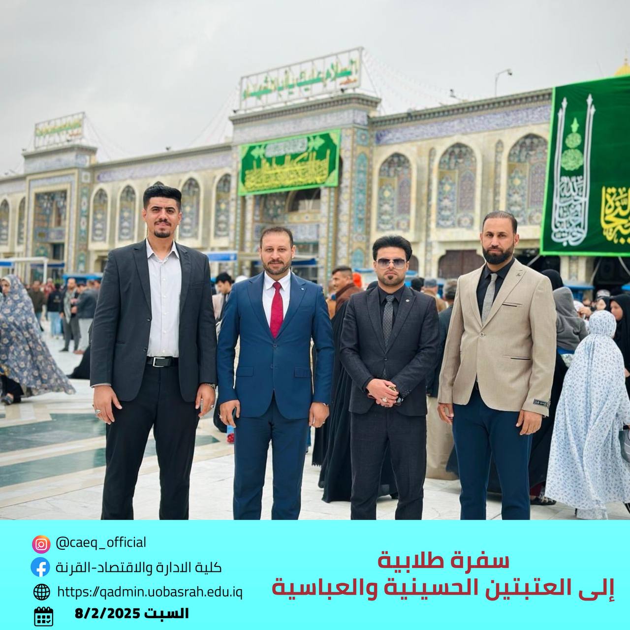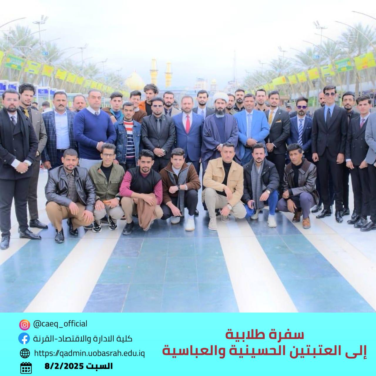 As part of the ongoing collaboration between the College of Administration and Economics – Qurna and the Holy Hussaini Shrine, the college organized a student trip to the Hussaini and Abbasid shrines on Friday and Saturday, February 7-8, 2025. The trip was attended by 40 students, along with several faculty members, and was supervised by Sheikh Qahtan Al-Hilfi, the representative of the supreme religious authority in the Qurna district.
