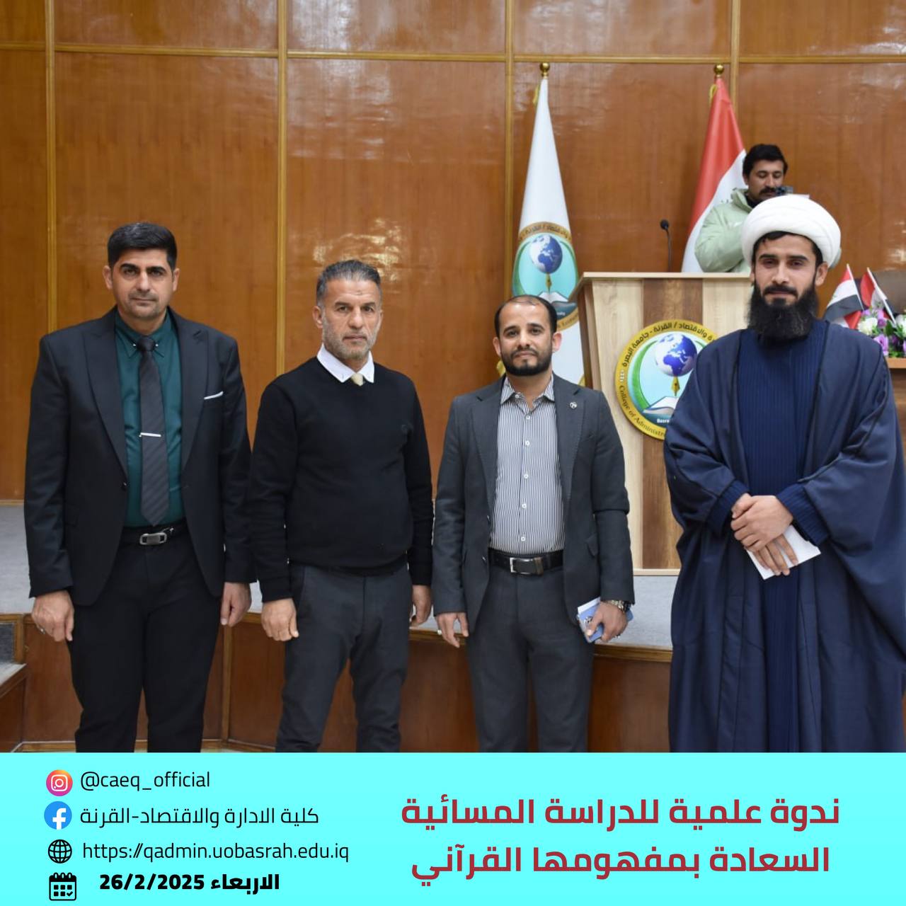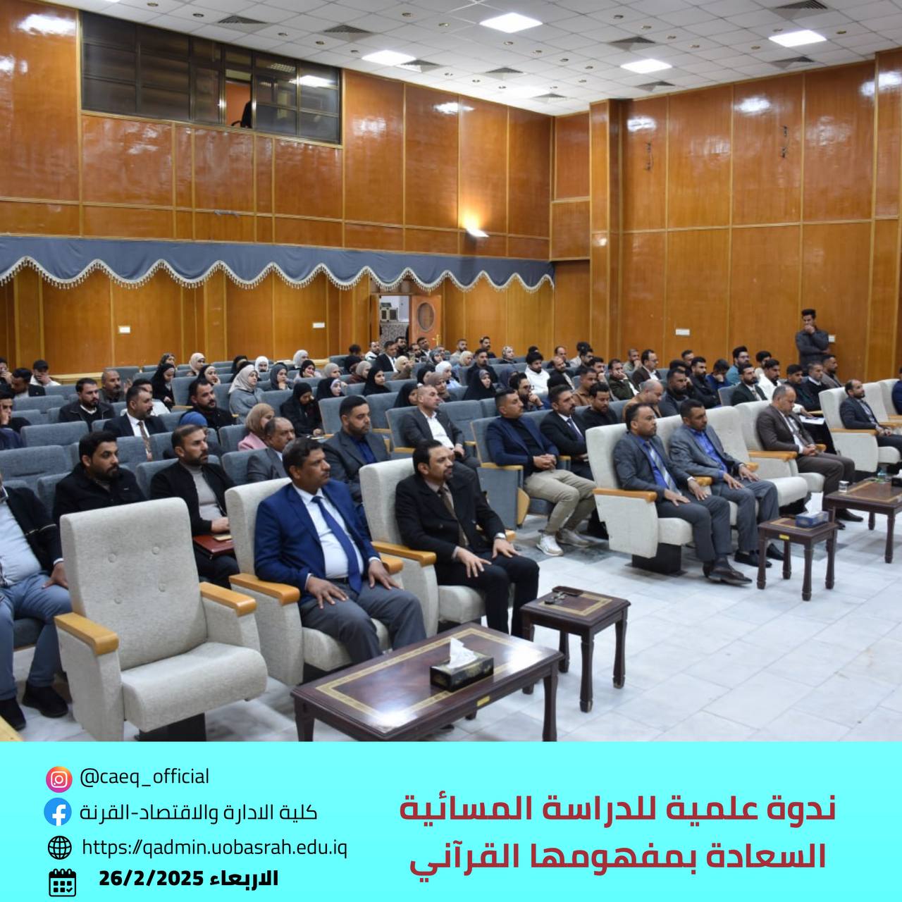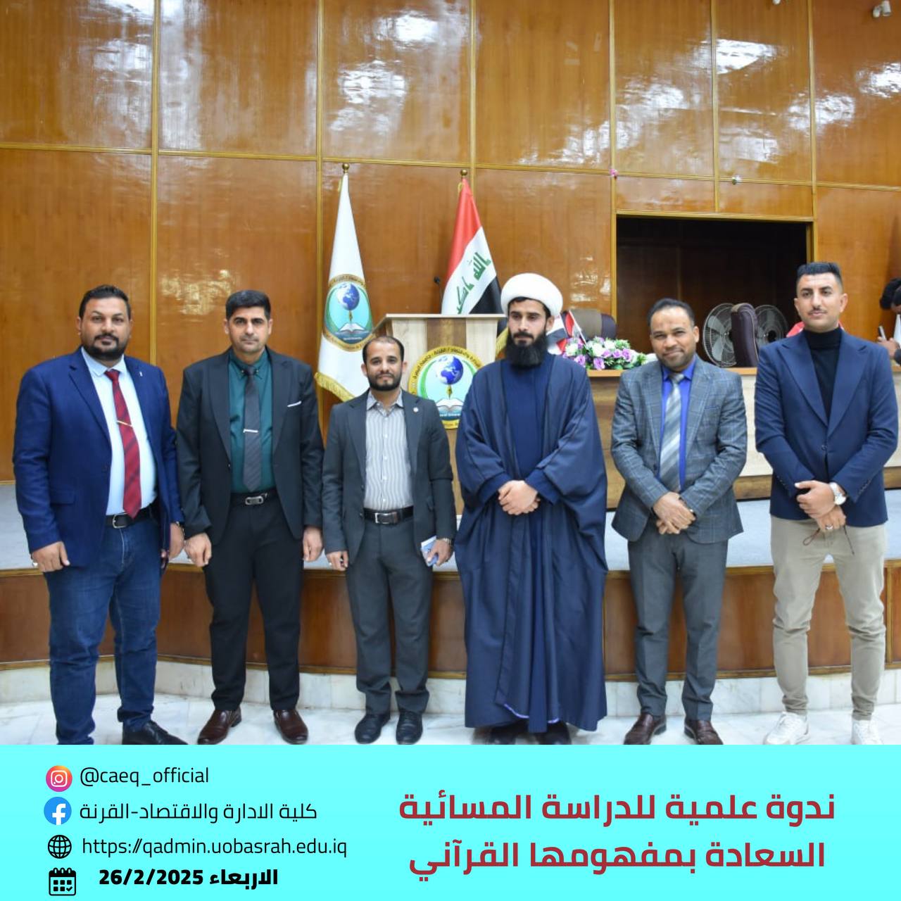 The College of Administration and Economics – Qurna at Basra University, in collaboration with the Psychological Counseling and Educational Guidance Unit, organized a scientific seminar titled “Happiness in Its Qur'anic Concept” on Wednesday, February 26, 2025. The seminar was presented by Sheikh Qahtan Al-Halfi to the evening study students.