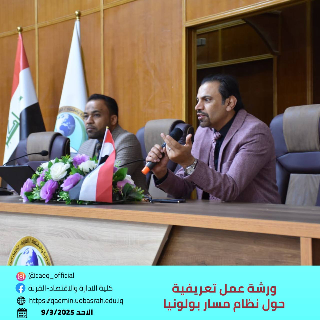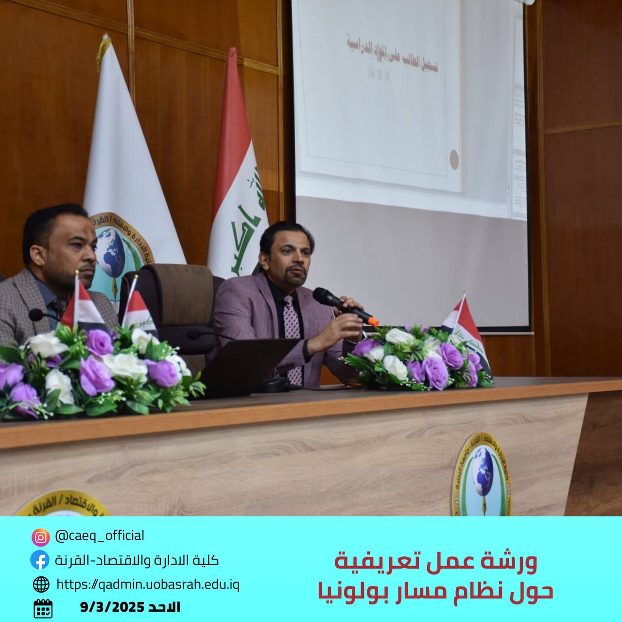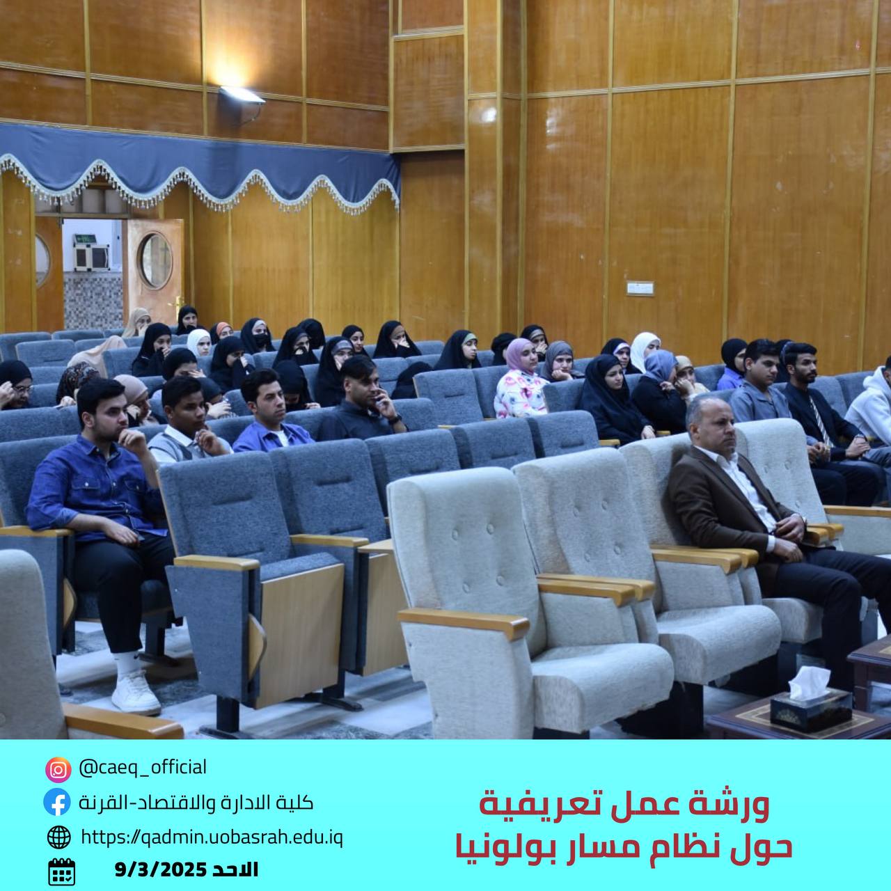 The College of Administration and Economics/Al-Qurna at the University of Basrah organized an introductory and guidance workshop on the Bologna Process system for first-year students in the Departments of Project Management and Finance and Investment. The workshop took place on Sunday, March 9, 2025.
