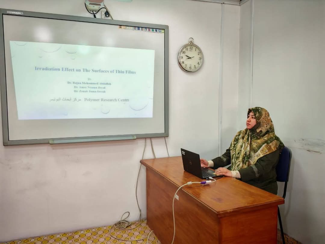 The seminar, presented by Dr. Raja Mohammed Abdullah, reviewed the importance of thin films in technological and industrial fields, their potential application in electronic devices, solar cells, transistors, and linear and nonlinear optical applications. It also addressed the effect of irradiation on the morphology of thin films using possible diagnostics, and the scientific methods for preparing thin films using gamma rays.