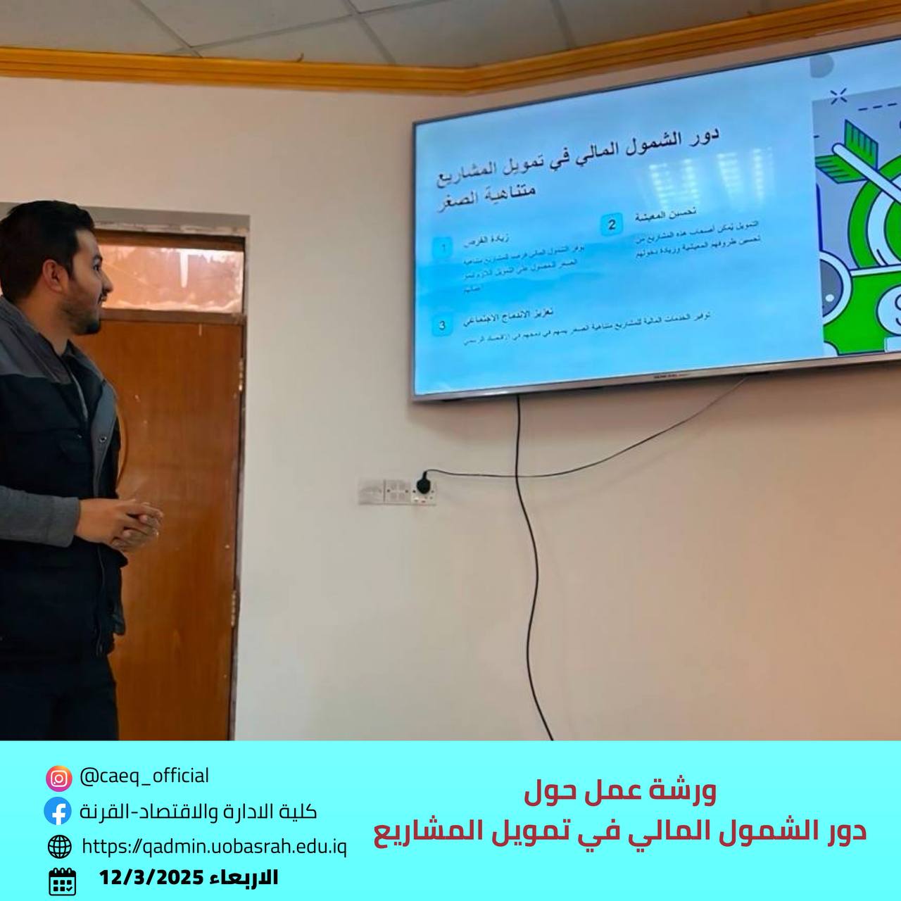 The Investment and Finance Department at the College of Administration and Economics – Al-Qurna, Basra University, organized a workshop titled "The Role of Financial Inclusion in Project Financing," aimed at enhancing the knowledge of fourth-year students about the importance of financial inclusion and its role in supporting the business sector.