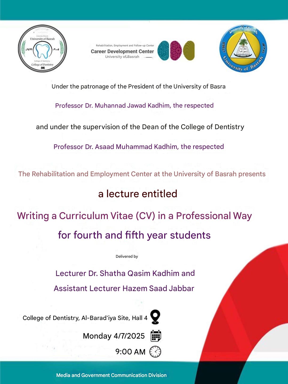 The College of Dentistry, in cooperation with the Rehabilitation and Employment Center at the University of Basra, will hold a lecture entitled (Writing a Professional CV)