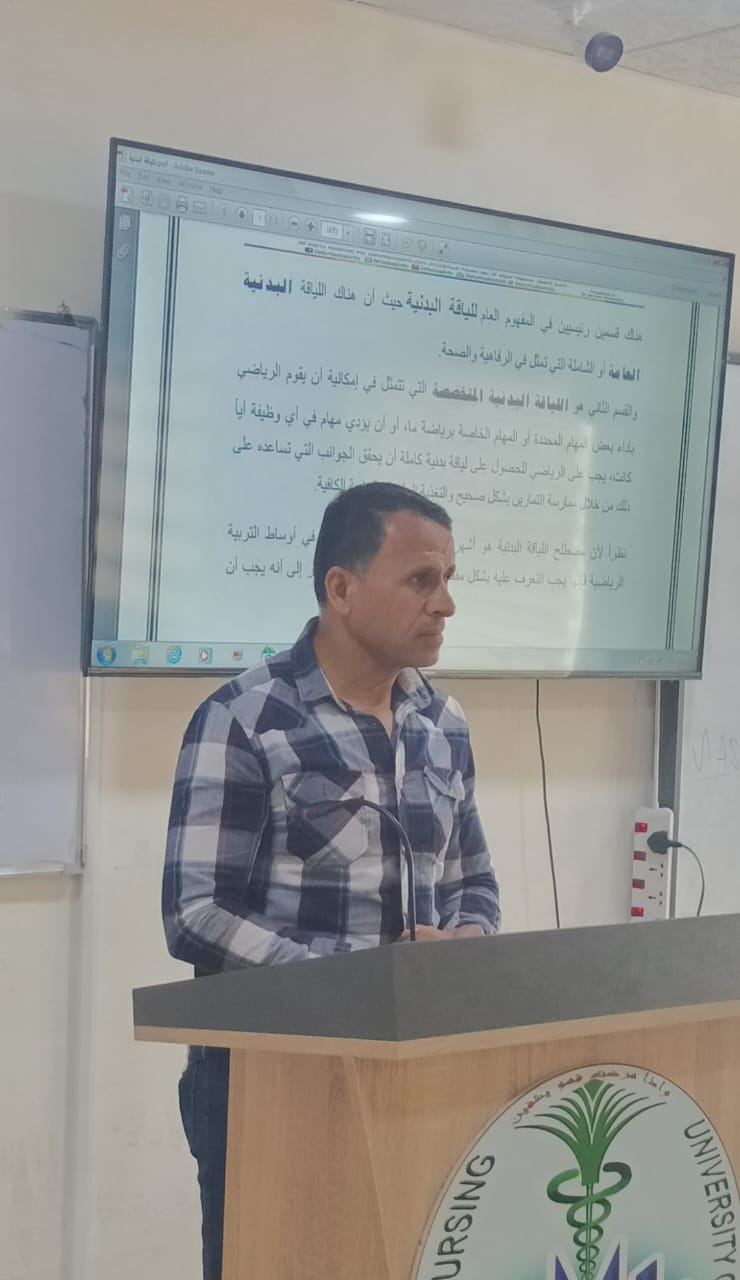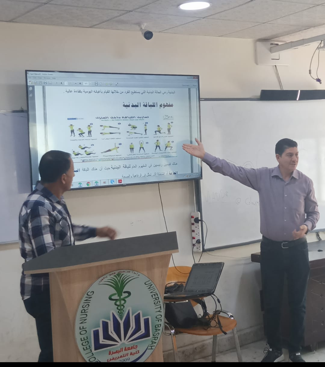 College of Nursing MediaUnder the patronage of the Dean of the College of Nursing at the University of Basra, Assistant Professor Dr. Majid Asghar Muhammad Al-Nawab, the College's Continuing Education Unit organized a scientific lecture on the impact of physical fitness on the health of university students. The lecture was delivered by Assistant Professor Dr. Zuhair Salem Abdul Razzaq, Director of the Student Activities Unit, and Assistant Professor Dr. Faisal Ghazi Abdul Hassan.