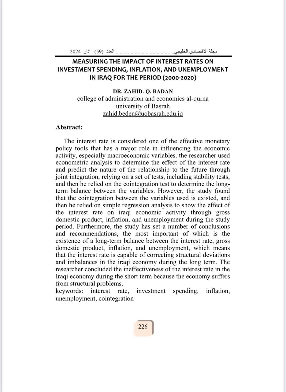 3. “Measuring the Impact of Interest Rates on Investment Spending, Inflation, and Unemployment in Iraq (2000–2020)”, published in the Gulf Economy Journal.
