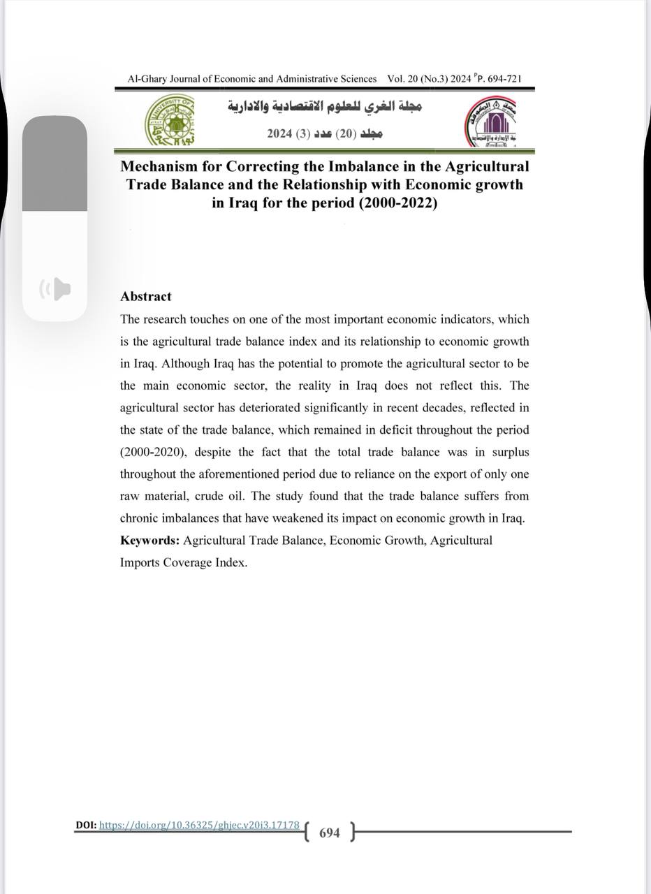 4. “The Mechanism for Correcting the Imbalance in the Agricultural Trade Balance and Its Relationship to Economic Growth in Iraq (2000–2022)”, published in the Al-Ghari Journal of Economic and Administrative Sciences.
