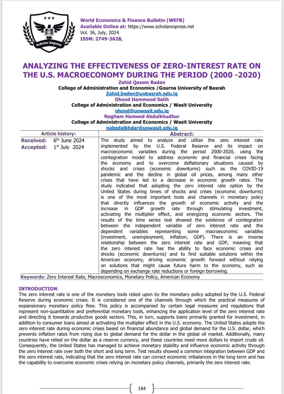 Dr. Zahed Qasim Badhan, Assistant Professor at the College of Administration and Economics – Qurna, University of Basrah, in collaboration with researchers from the University of Wasit, has published a scientific study titled “Analyzing the Effectiveness of the Zero Interest Rate Policy on the U.S. Macroeconomy During the Period (2000–2020)” in the World Economics & Finance Bulletin, in its July 2024 issue.