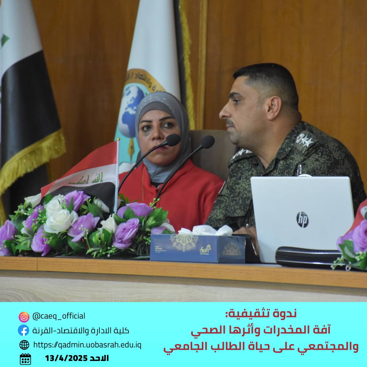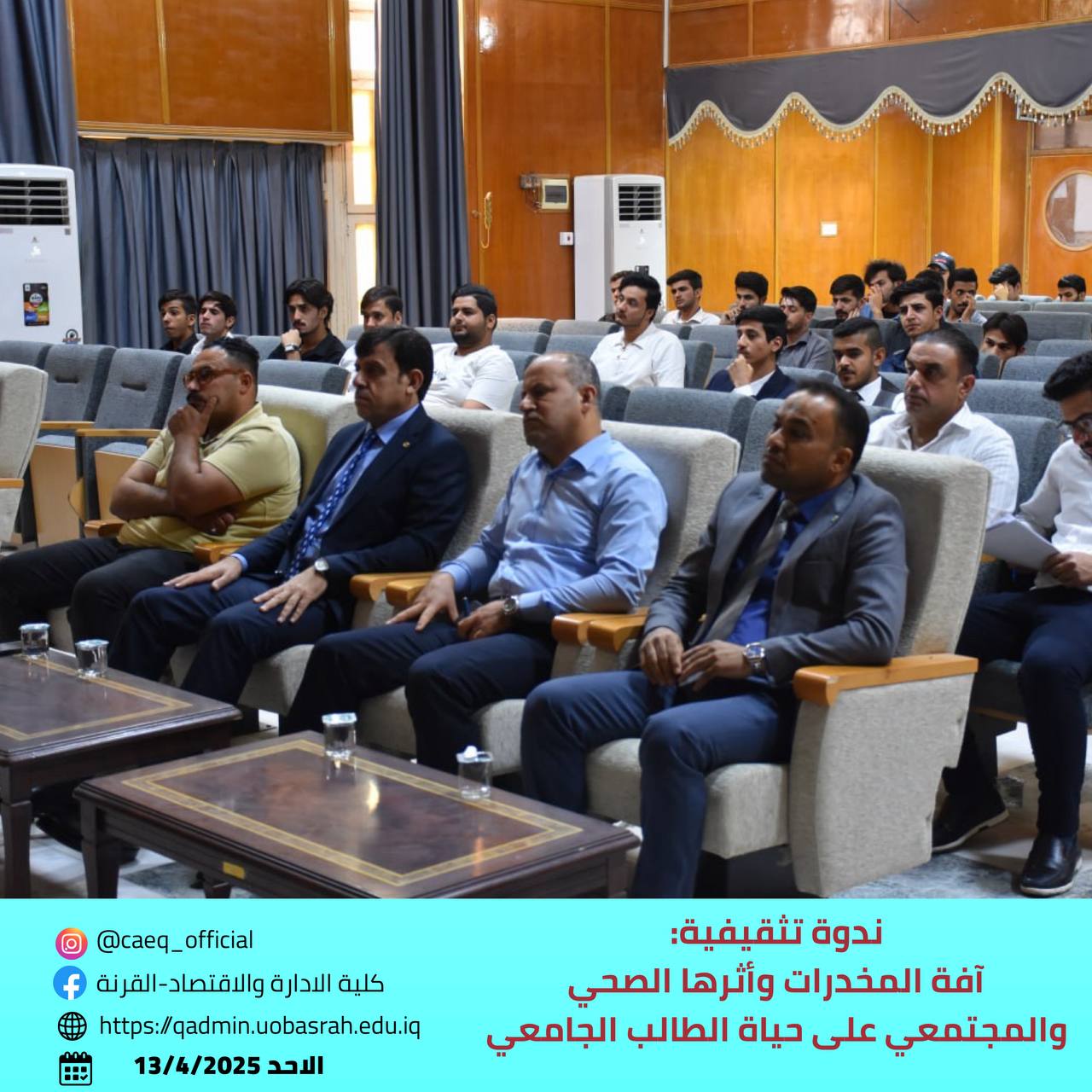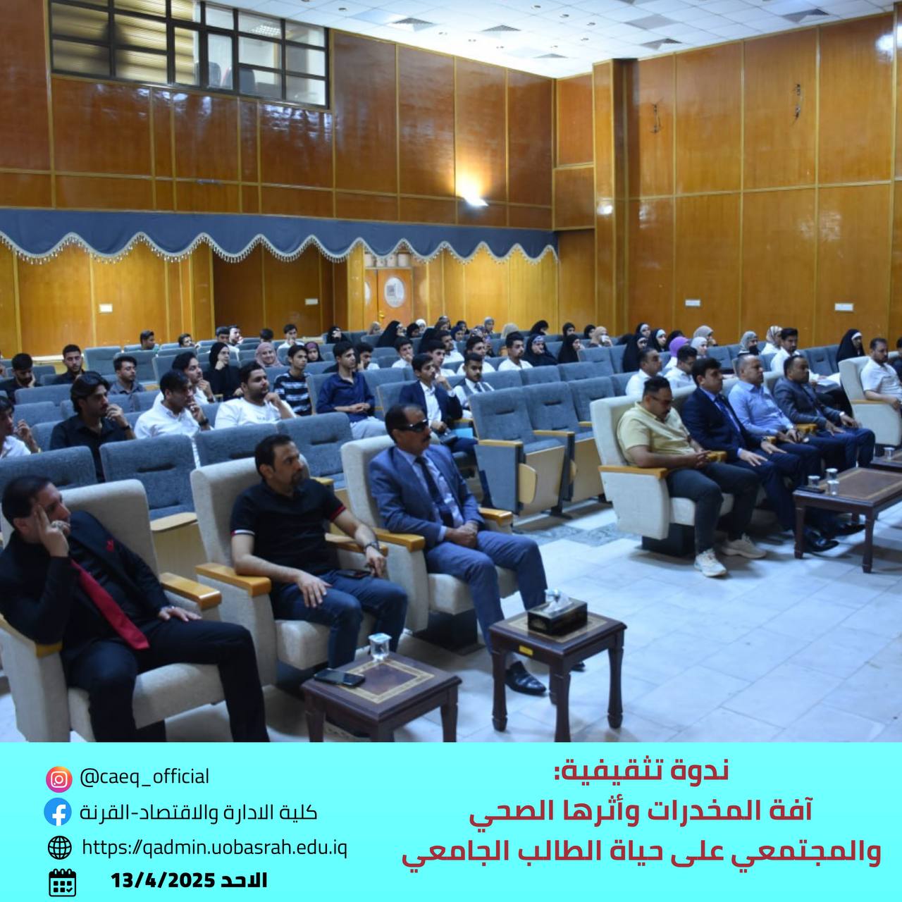 The College of Administration and Economics in Qurna, in cooperation with the Continuing Education Unit and the Educational Guidance Unit, organized an awareness seminar titled “The Scourge of Drugs and Their Health and Social Impact on the Life of the University Student” on Sunday, April 13, 2025, in the college’s main hall.