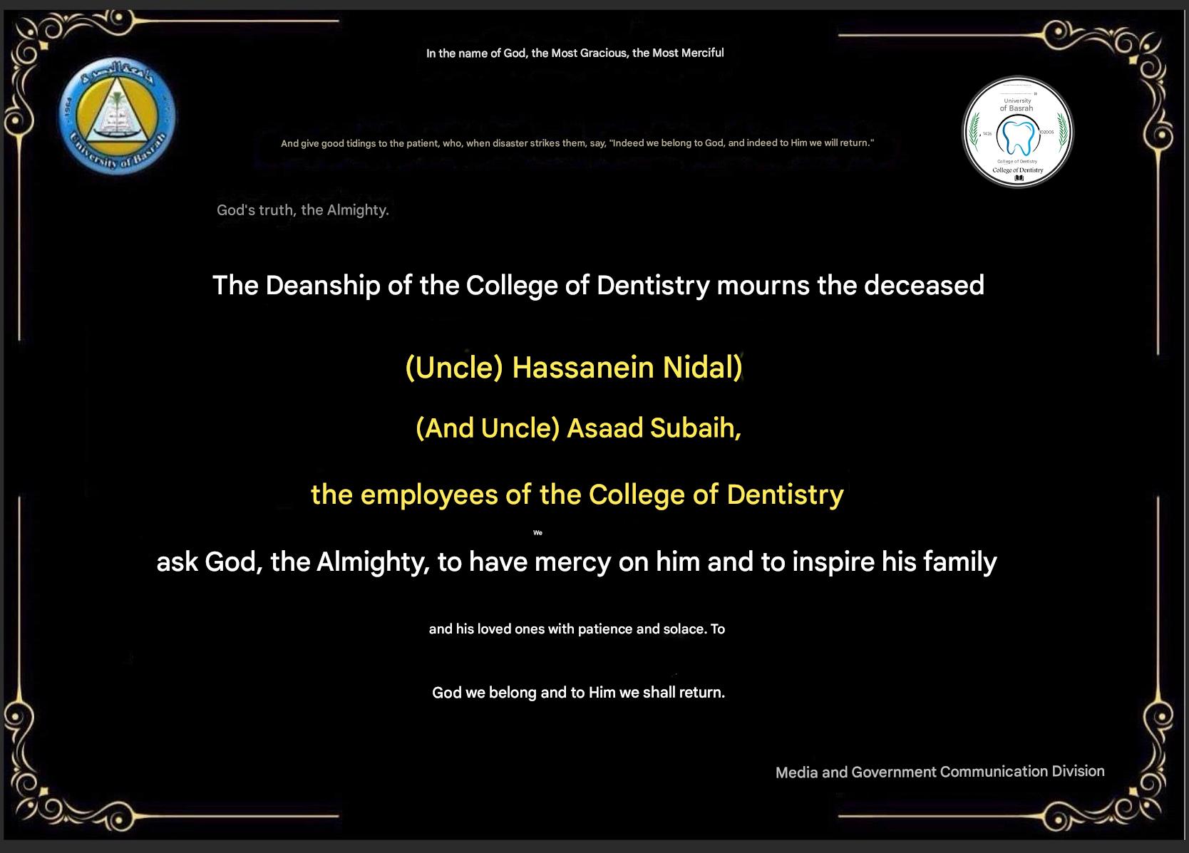 The College of Dentistry extends its condolences to the employees, Hassanein Nidal and Asaad Subaih.