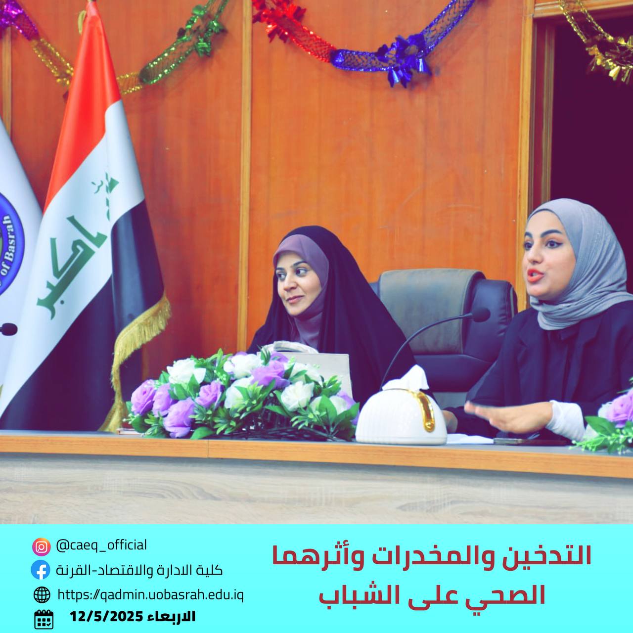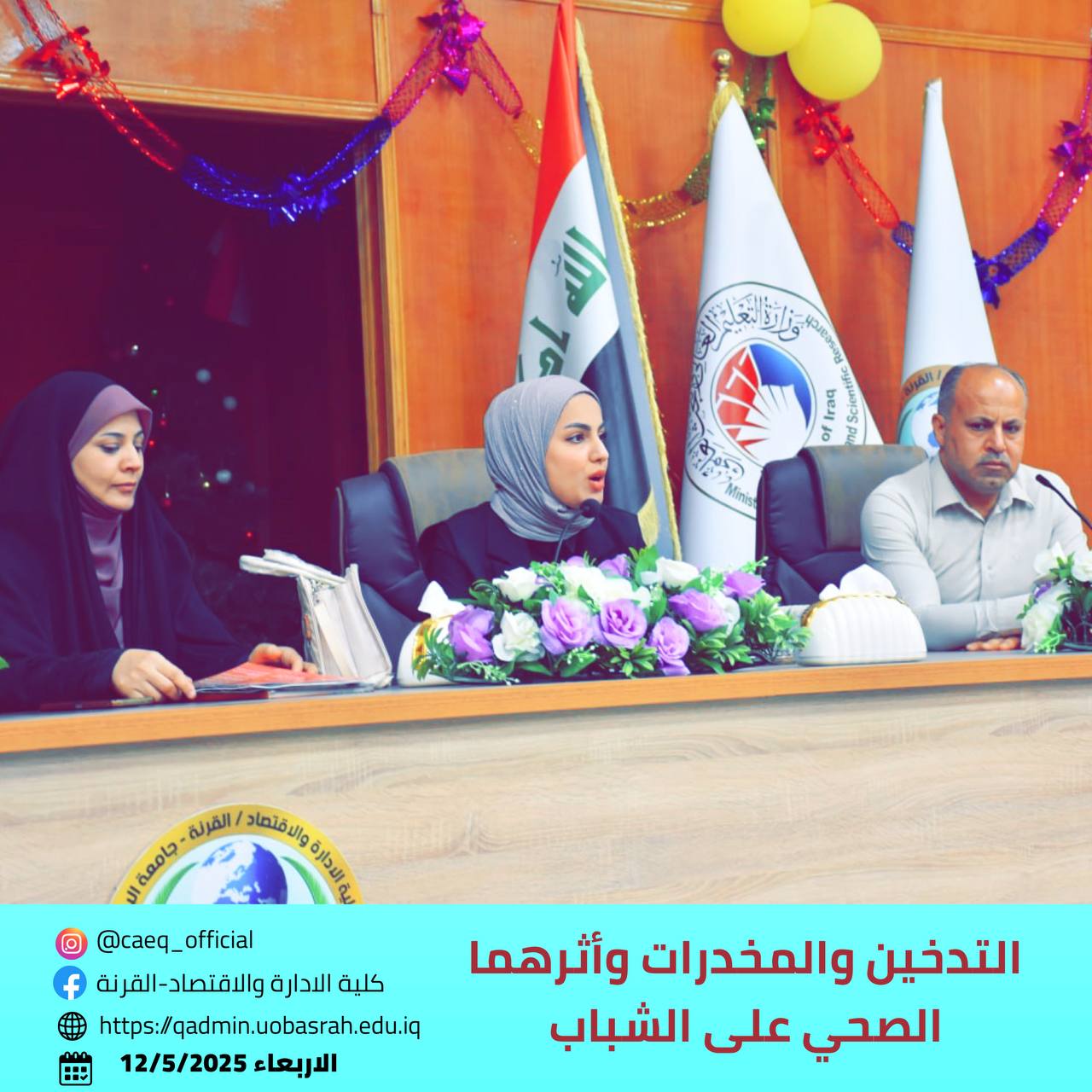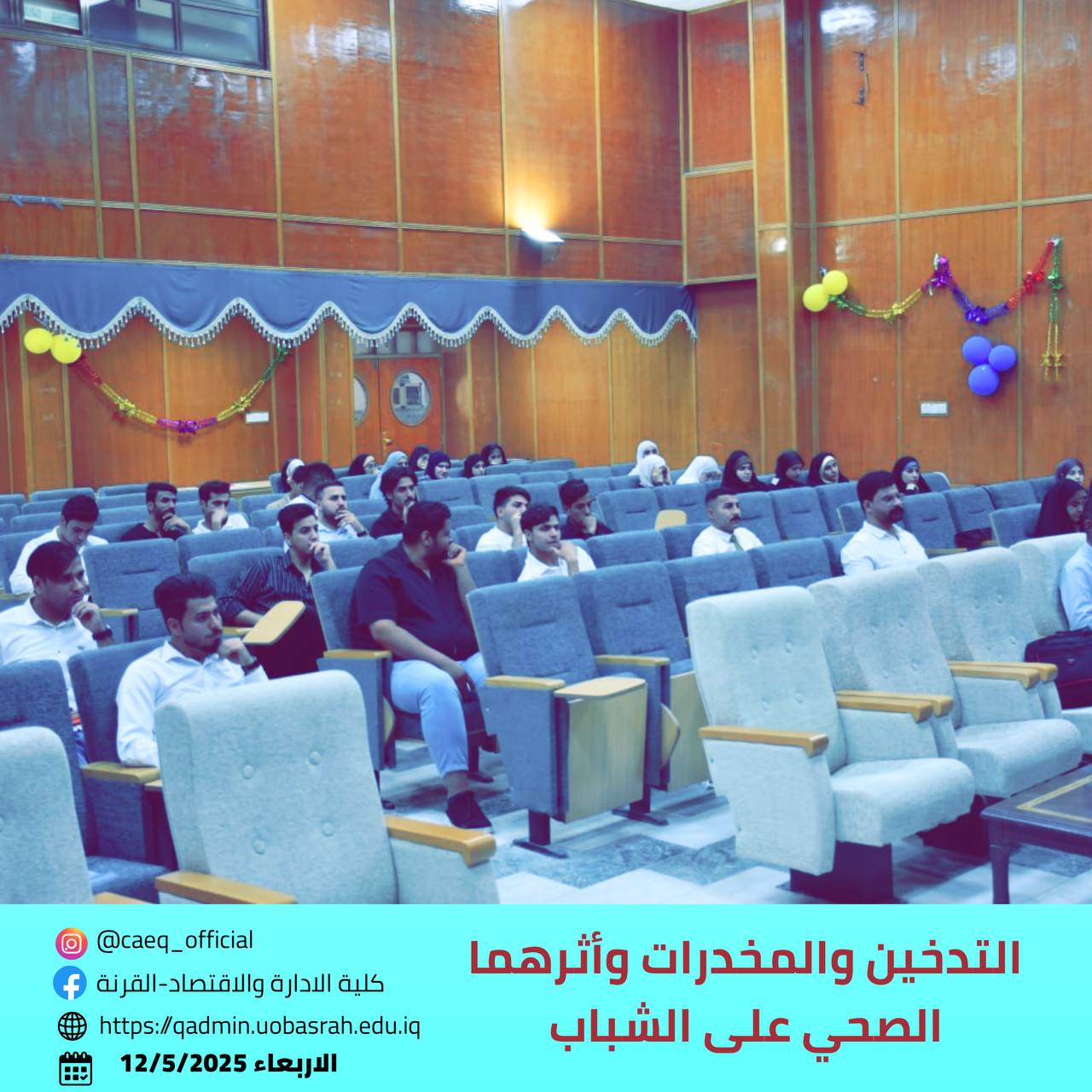 The College of Administration and Economics in Qurna, in cooperation with the Health Center in Al-Suwailih, the Continuing Education Unit, and the Educational Guidance Unit, organized an educational seminar entitled “Smoking, Drugs, and Their Health Impact on Youth” on Wednesday, May 7, 2025, in the college’s main hall.