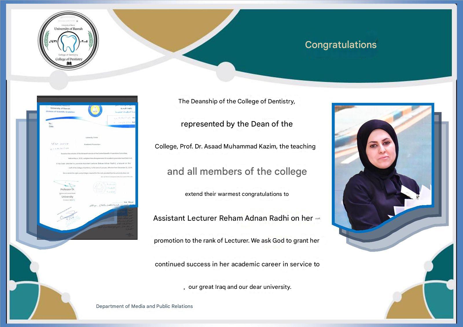 Congratulations from the College of Dentistry to Assistant Professor Reham Adnan