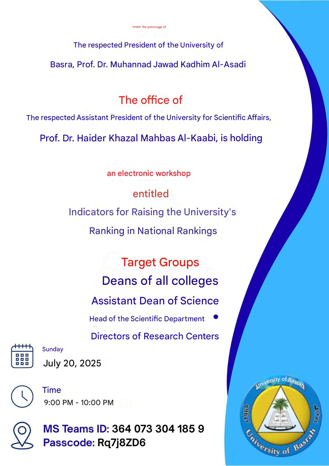 The Office of the Assistant President of the University is holding an electronic workshop entitled "Indicators for Raising the University's Ranking in National Rankings."