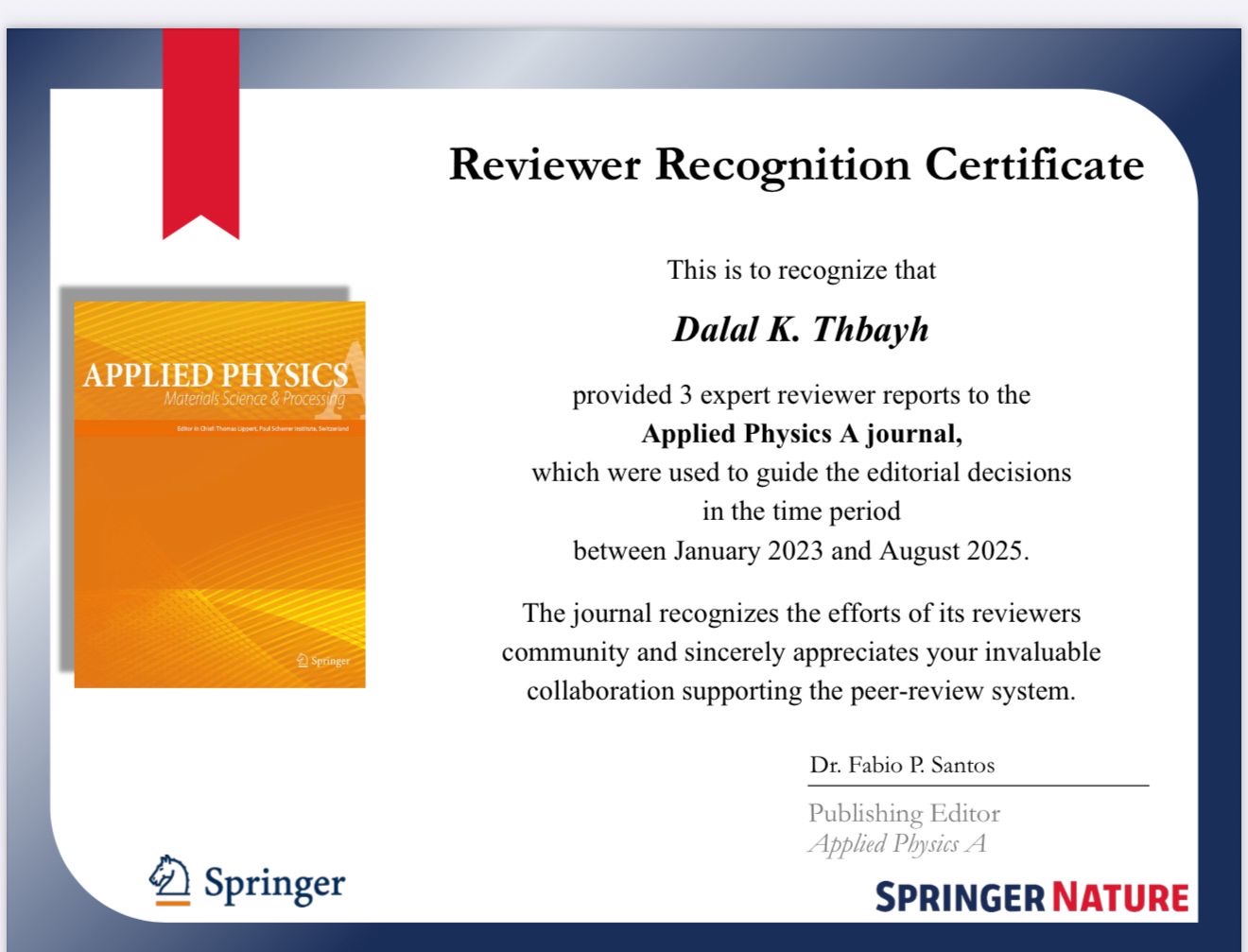 Dr. Dalal K.D. received a Certificate of Appreciation as a Scientific Reviewer in Applied Physics, a Springer Nature journal, in recognition of her contributions to scientific research review between January 2023 and August 2025. Scientific research review is an essential part of advancing science, ensuring the quality of research, and supporting the scientific community. This experience was a valuable opportunity for Dr. Dalal to contribute to this scientific path in collaboration with her fellow researchers in the fields of applied physics and materials science.