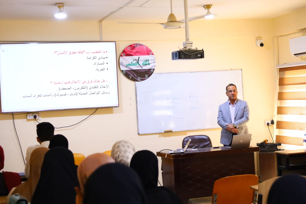 The Continuing Education Unit at the Faculty of Nursing at the University of Basra organized a symposium on the role of the media in spreading the culture of human rights, in which the teacher, Dr. Fatima Jassim Mohamed, attended the directors of the Women's Affairs Division and assistant teacher Riyad Hussein Taqi, director of the Legal Division in the presence of the college students, in the context of promoting awareness of the importance of the media in consolidating the principles of human rights.