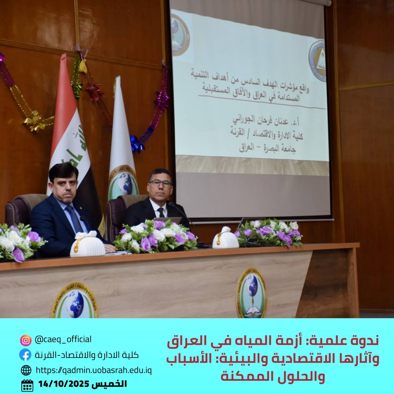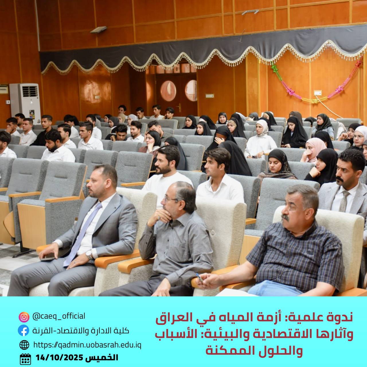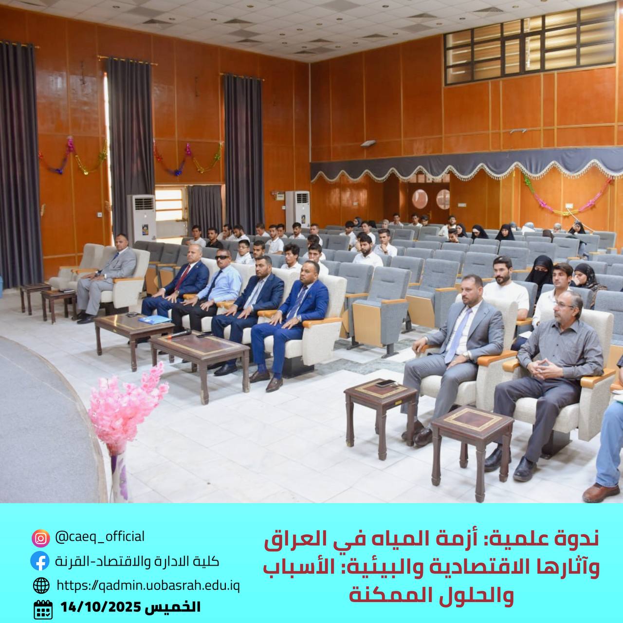 The College of Administration and Economics in Qurna, under the patronage of the President of the University of Basrah, Prof. Dr. Muhannad Jawad Al-Asadi, and the supervision of the Dean of the College, Prof. Dr. Adnan Farhan Al-Jourani, organized a scientific symposium entitled “The Water Crisis in Iraq and Its Economic and Environmental Impacts: Causes and Possible Solutions.” The event took place on Tuesday, October 14, 2025, in the main hall of the college.