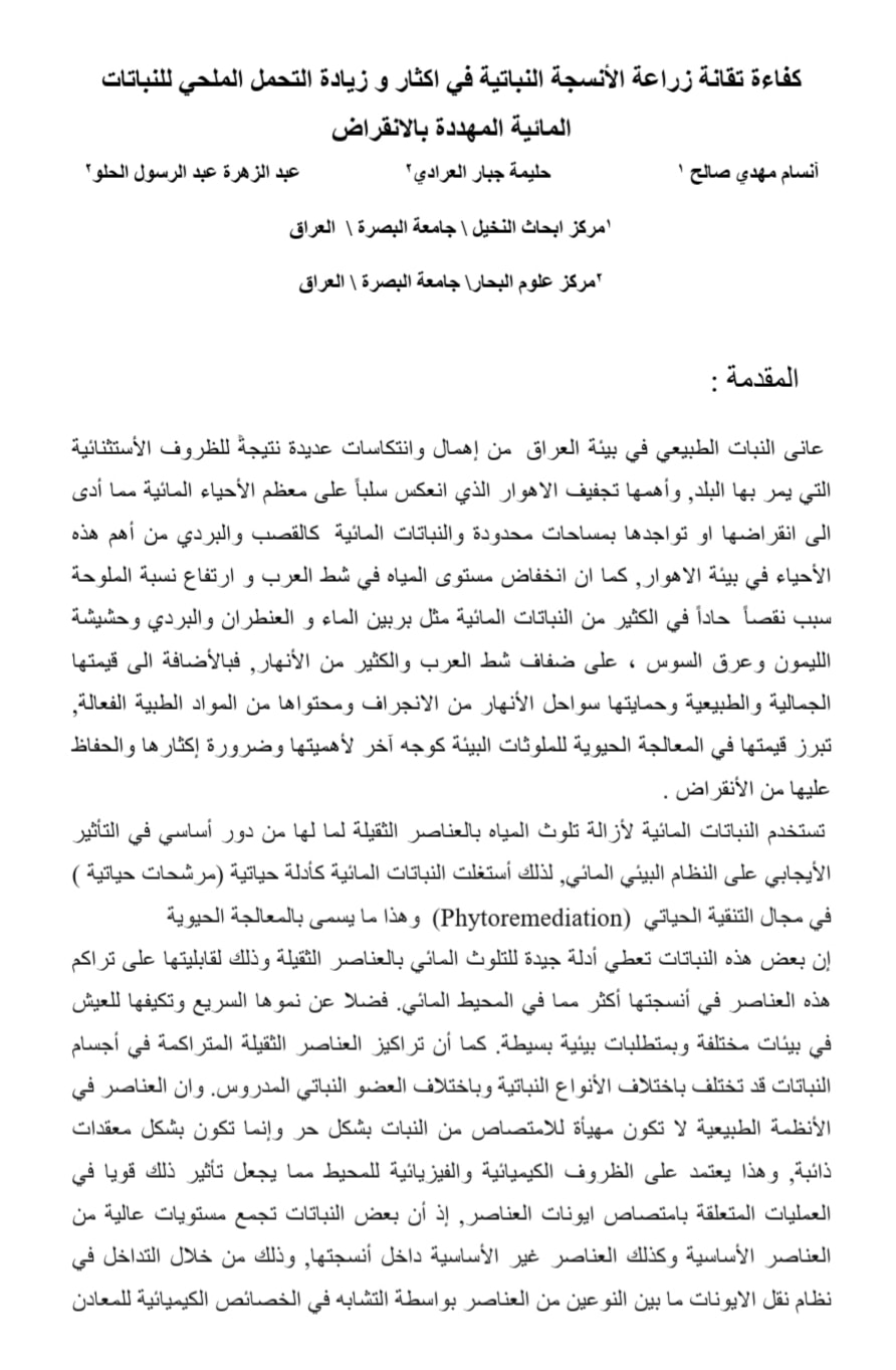 Assistant professor from the Date Palm Research Center, Ansam Mahdi Salih, in cooperation with researchers from the Marine Sciences center, completed a scientific study entitled (Efficiency of plant tissue culture technology in propagating and increasing the salt tolerance of endangered aquatic plants) to the Basra Agriculture Directorate within the frameworks of cooperation and scientific communication with state institutions and for Upgrading the agricultural reality.