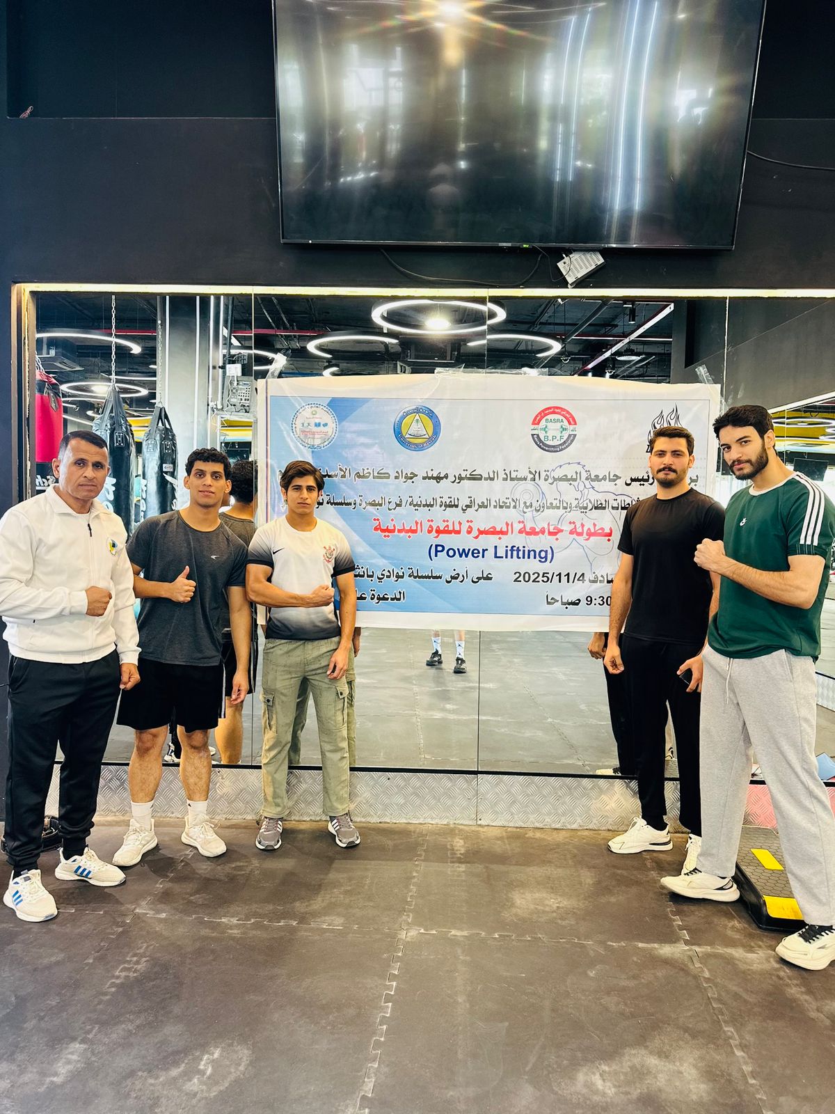 The College of Nursing at Basra University participated with its student team in the Basra University Powerlifting Championship, held at the Panther Sports Hall in the Al-Sa'i area. Student Karrar Yousef, a third-year evening student, achieved third place in the 59 kg weight class. Thirteen colleges from Basra University participated in the championship.