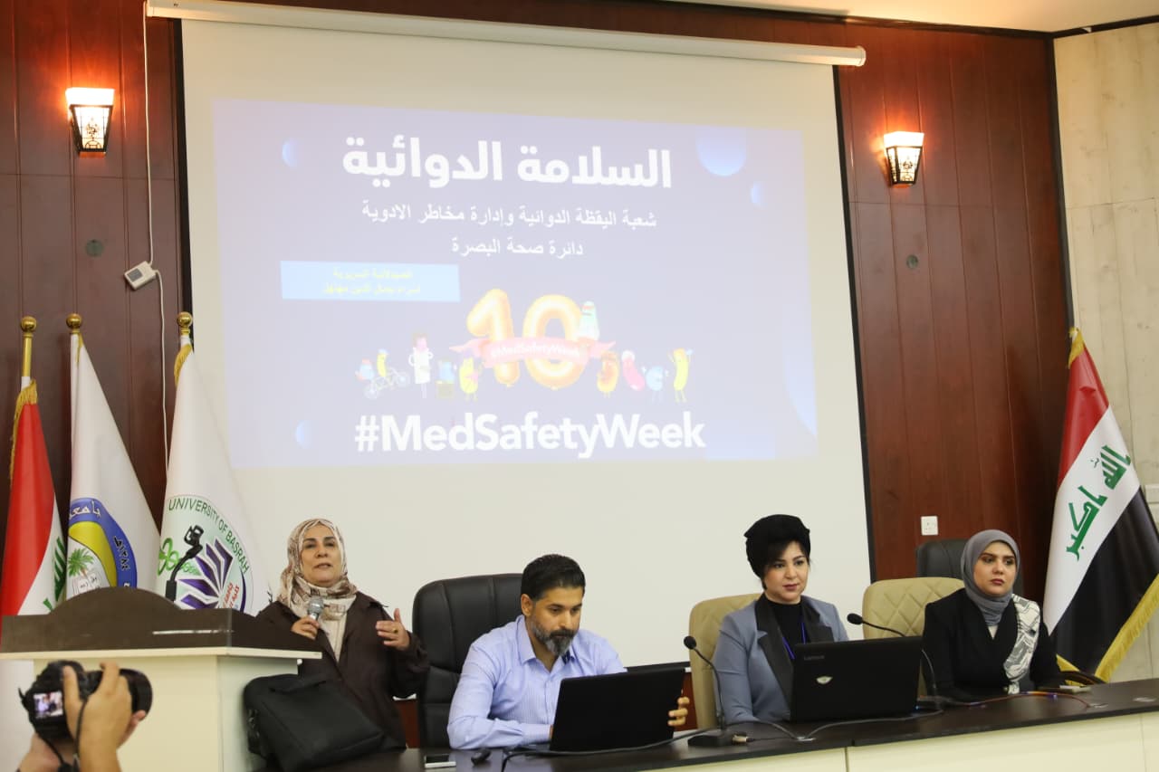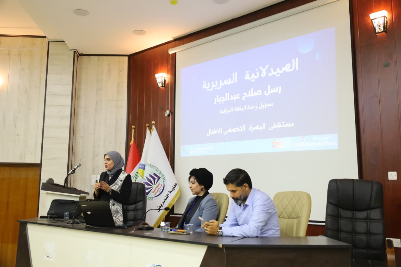The Continuing Education Unit, in cooperation with the Pharmacovigilance Division of the Pharmacy Department at the Basra Health Directorate, and the Human Rights Unit at the College of Nursing, organized a scientific seminar on pharmacovigilance under the slogan "Your Safety First." The seminar featured presentations by pharmacists Israa Jamal Al-Din, Rasel Abdul-Jabbar, Ahmed Mohammed Awda, and Ahmed Mohammed Majeed, all from the Basra Health Directorate.