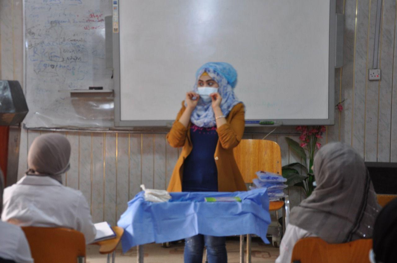 The workshop aimed at urging students to use and wear appropriate personal protective equipment, which included (durable gloves and muzzle, eye protection, face shield and protective glasses) and a long-sleeved medical gown and closed shoes, to maintain personal safety and prevent transmissible diseases. |