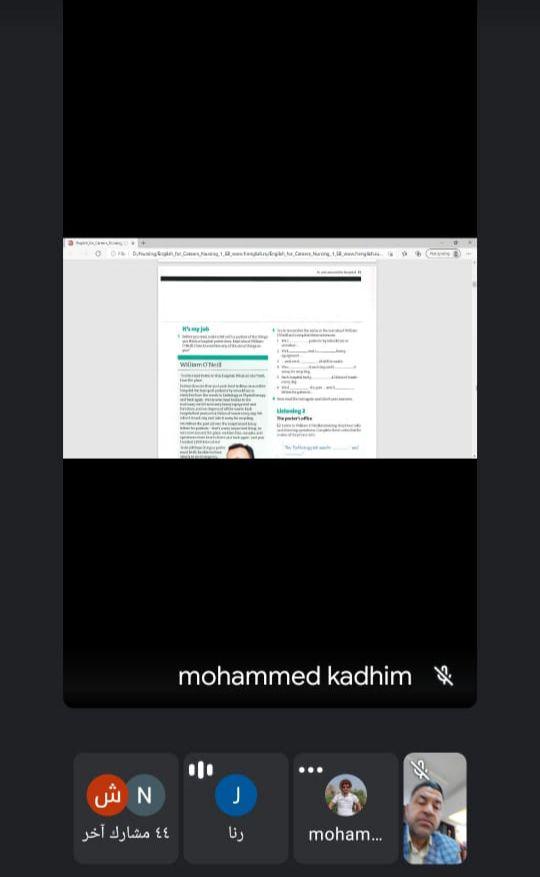Alaa Al-Husseini... Prof. Abdulameer Abdullah Almusawi, Dean of the College of Nursing at Basrah University, also returned to us to follow the series of daily intensive electronic lectures for our college students. He directly followed the English language course for the first stage of the morning study, in which Assistant Lecturer Muhammad al-Kanani lectured.On the one hand, Almusawi praised the teaching method, adequate explanation, and repeating some important points, focusing on what the student needs in nursing in the future and focusing on it.