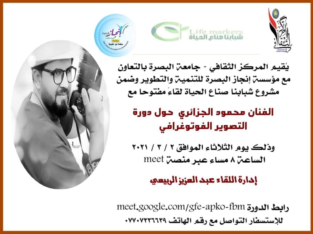 The Cultural Center at the University of Basra is pleased to dedict you best regards and announces its intention to organize an open meeting with the artist Mahmoud Al-Jazairy on the photography course on Tuesday, 3/2 at 8 pm. To participate, please access the meet platform)) and write the following link: