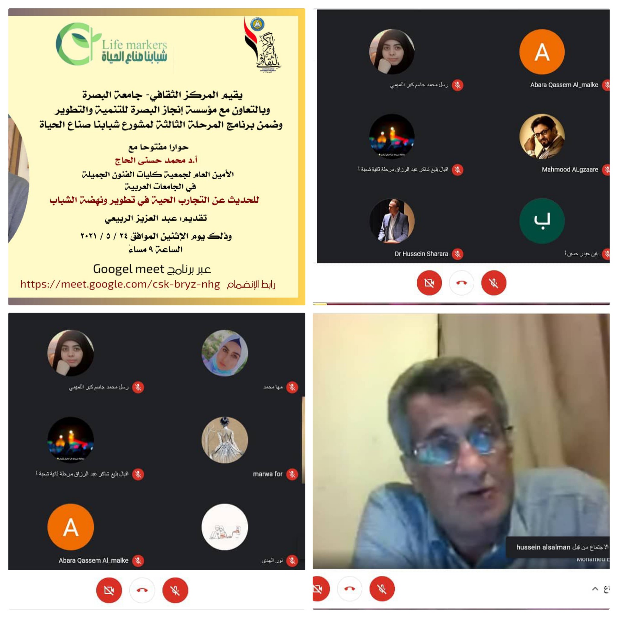 Within the program of the third phase of the project of our youth, the makers of life, which is established by the Cultural Center at the University of Basra in cooperation with Injaz Foundation for Development and Development. The open dialogue seminar, which was presented on the (googal.meet) platform, Mr. Abdulaziz Hussein, started welcoming the attendees from various community segments.