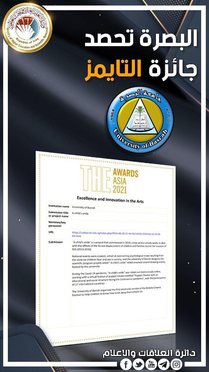 The University of Basra won the Times Award in the field of excellence and innovation in the arts, as it achieved first place in the ranking of Asian universities. According to the official certificate of the award published on the official website, the University of Basra scored excellence in the “Child’s Smile” project, which was held in cooperation with the Directorate of Education of Basra Governorate to develop children’s abilities through various artistic works to deal with the effects of forced displacement and overcome psychological crises. It is noteworthy that the Times launches various awards in several fields to mark the institutional performance and excellence of higher education in Asia. |