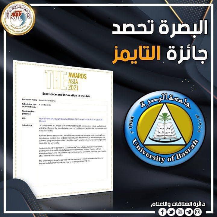 According to the official certificate of the award published on the official website (https://theawardsasia.com/2021/en/page/shortlist), the University of Basra recorded excellence in the (Child's Smile) project, which was held in cooperation with the Directorate of Education of Basra Governorate to develop the capabilities of children through various artworks to deal with the effects of forced displacement and overcome psychological crises.
