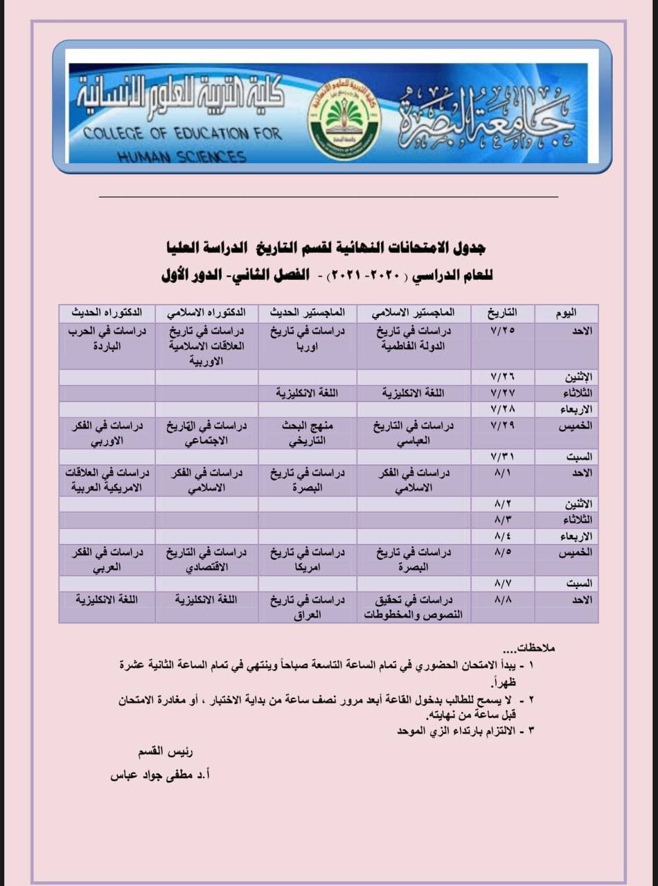 The Deanship of the College of Education for Human Sciences announces the schedule of final exams for students of the History Department for the 2020-2021 school year