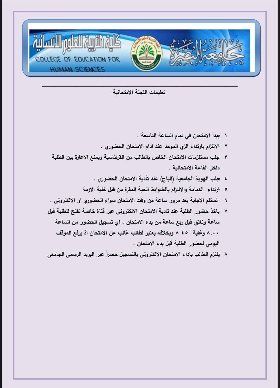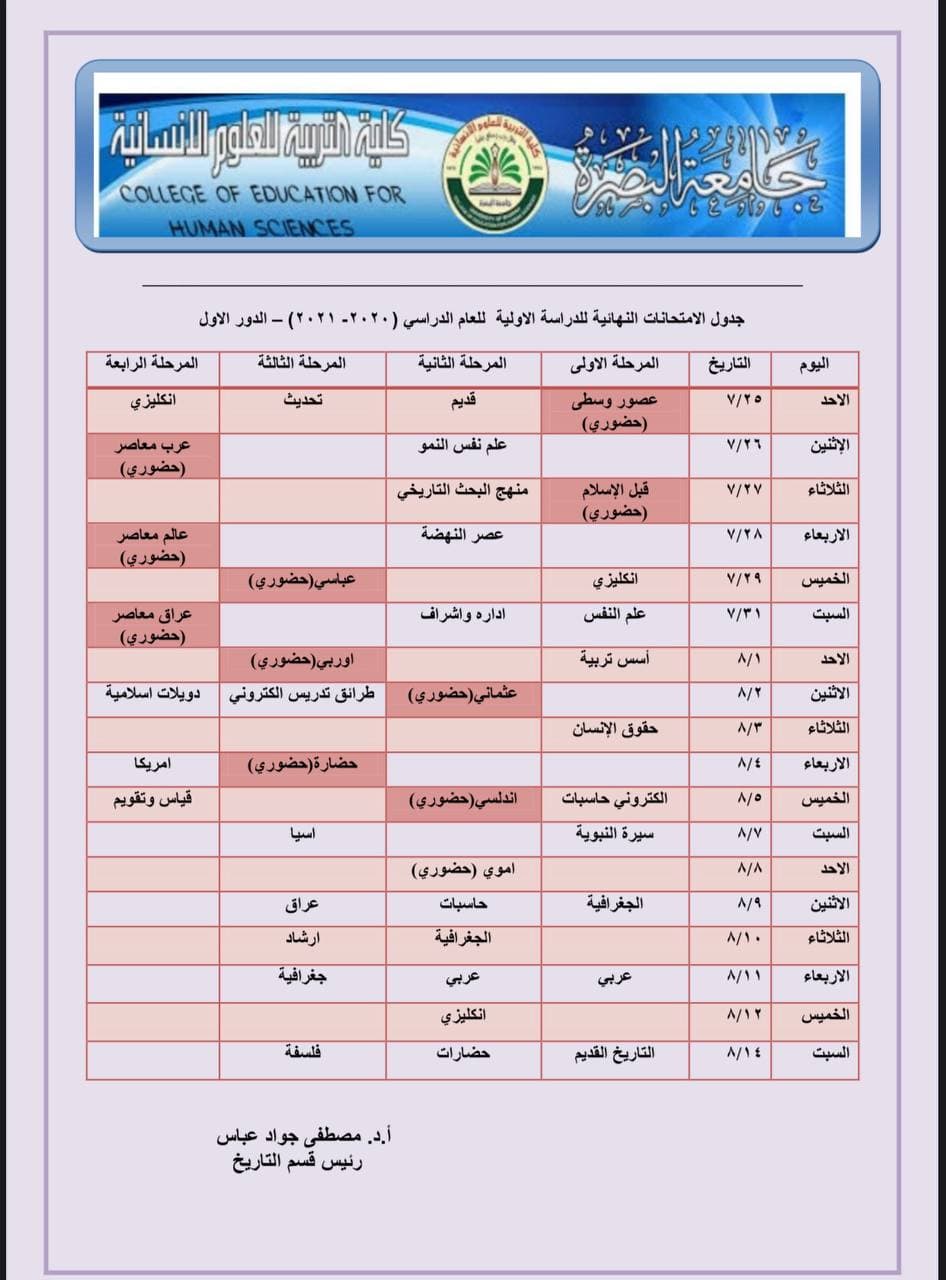 The Deanship of the College of Education for Human Sciences in the College of Education for Human Sciences announced the schedule of final exams for students of primary and higher studies in the History Department for the 2020-2021 school year.