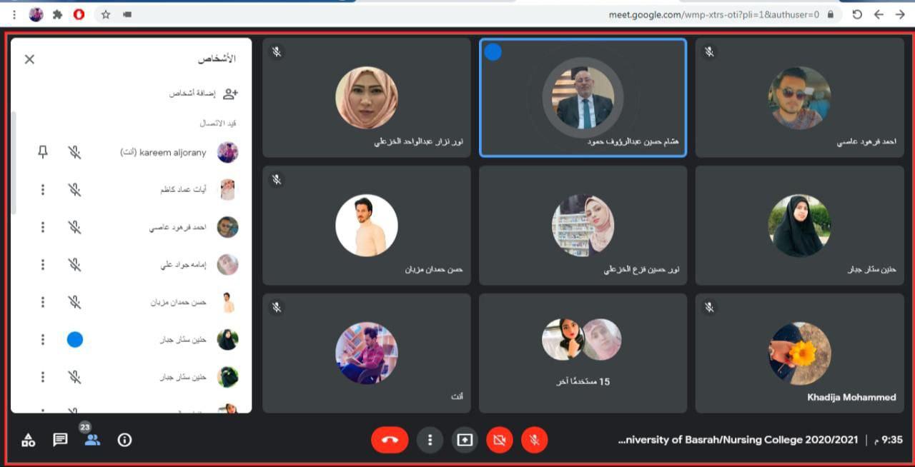 Under the auspices of the Deanship of the College of Nursing at the University of Basrah and the supervision of Prof. Dr. Abdulameer Abdullah Almusawi, Dean of the College, a scientific research was discussed within the graduation projects of students of the fourth stage, and the research prepared by students: Saja Abdul-Hassan, Marwa Abdul-Hassan and Ahmed Farhad, entitled (Factors of Preference between Private and Governmental Hospitals ).The discussion took place electronically via the “Coogle Meet” platform on Monday, 12/7/2021. The discussion committee was chaired by the Lecturer Dr. Husham Hussain, and the membership of the Lecturer Kazem Jawad and the Assistant Lecturer Khadija Muhammad. The study included a sample of auditors from some governmental and private hospitals using a questionnaire prepared for the purpose of studying their opinions about (provided services, cost of treatment and inpatient treatment, staff efficiency and their dealings with patients). The study demonstrated the divergence of opinions of the participants in the study in all aspects of the research, but the differences are not significant. Almusawi praised the research idea and the results and recommendations reached by the researchers and commended the efforts of the student researchers, the research supervisor and the discussion committee, wishing them more giving in the service of our dear college and university |
