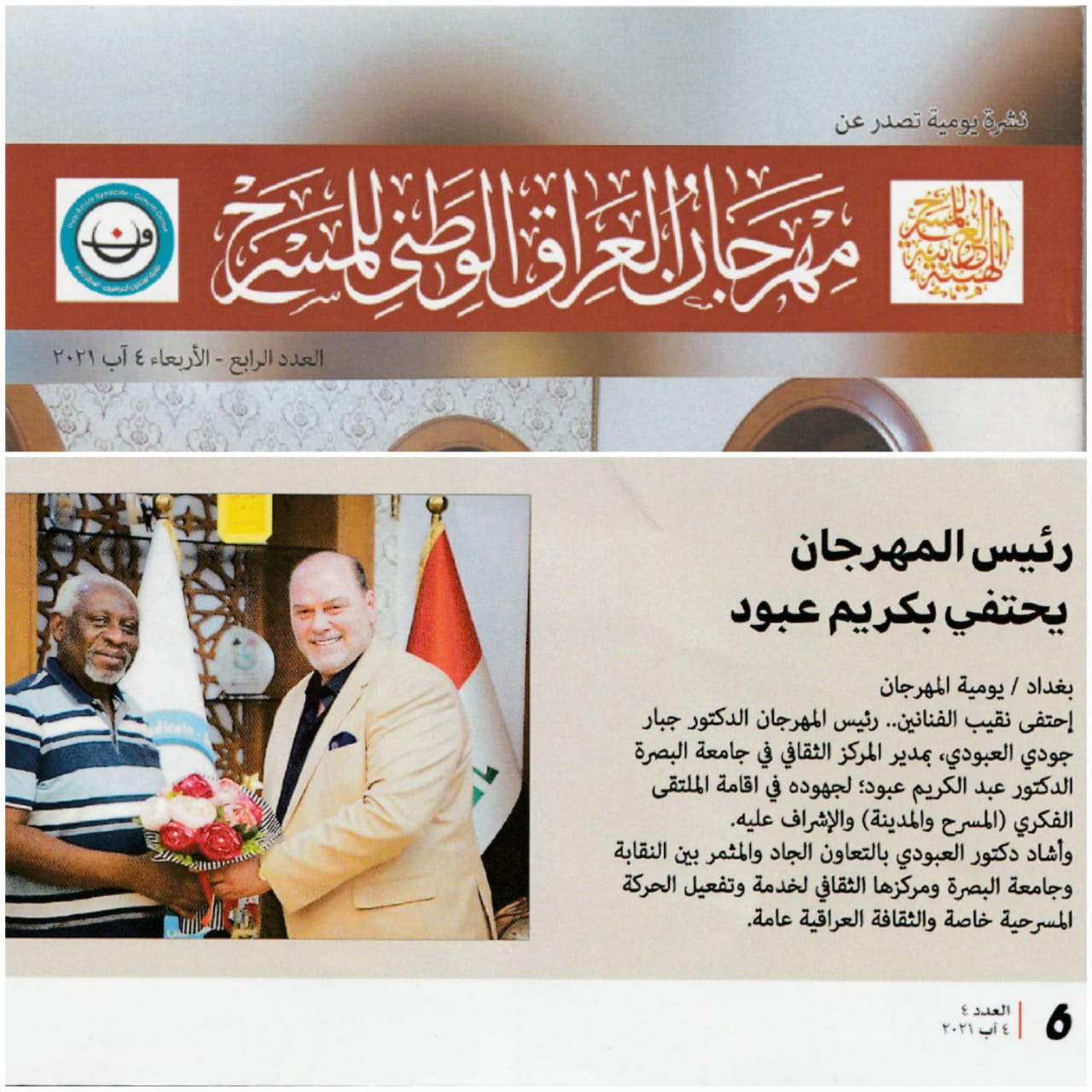 The daily bulletin of the Iraq National Theater Festival, the third issue, Tuesday, 3, August 2021, published an article on the celebration of the President of the Iraqi Artists and the President of the Festival, Jabbar Judy Al-Aboudi, Director of the Cultural Center at the University of Basra, for his effort to establish, manage and supervise the intellectual forum (theater and the city) and to perpetuate the circle of communication between the university, the union and society