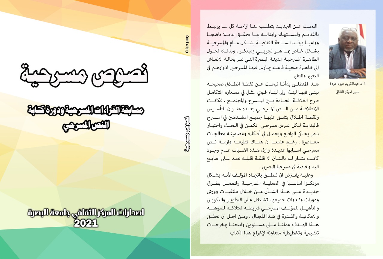 The Cultural Center, University of Basra, announces the issuance of a book of theatrical texts, which includes the theatrical products of the theatrical reading competition and the course of writing the theatrical text launched by the Cultural Center within the cultural center's plan for the year 2020/2021