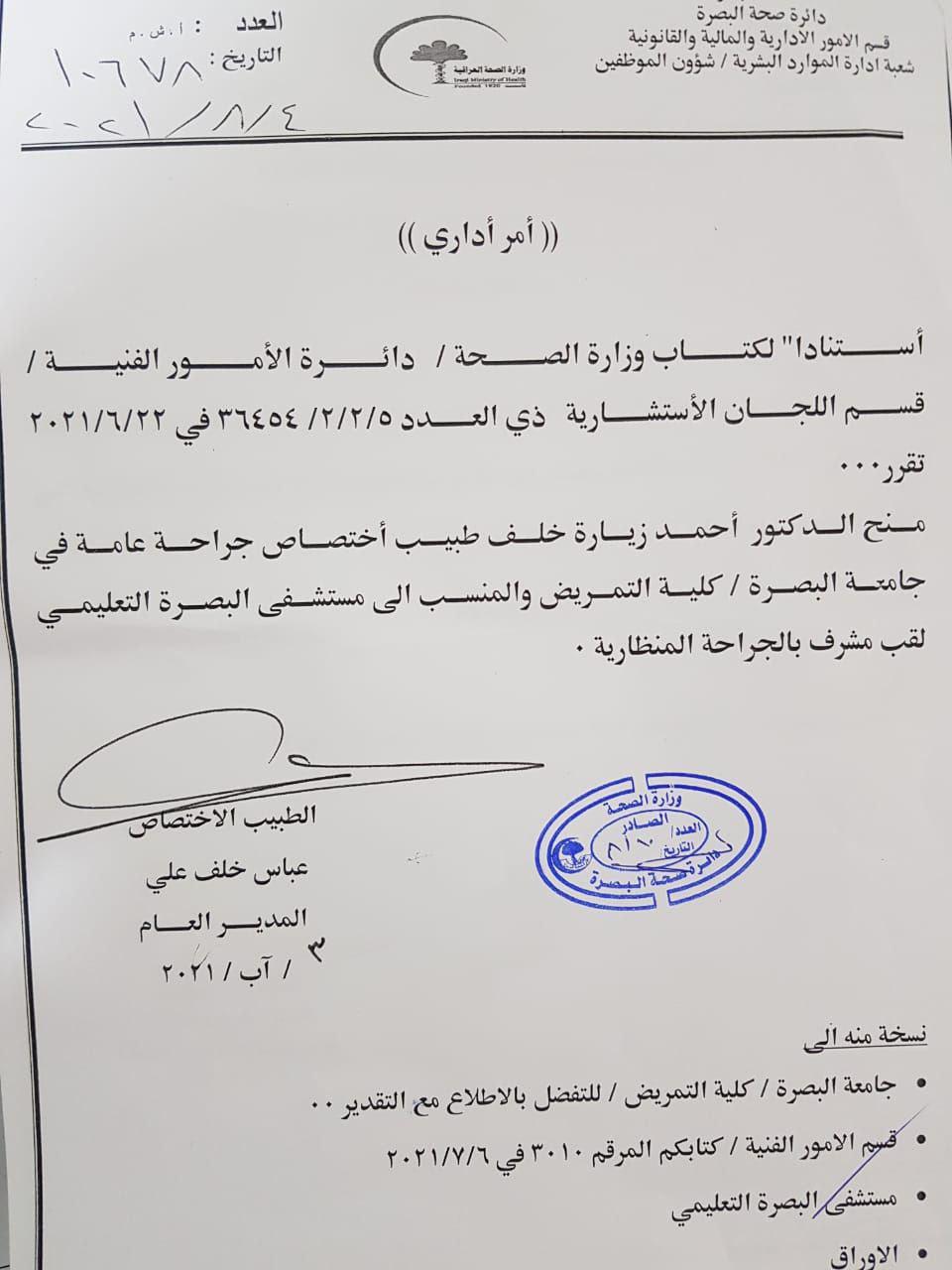 The instructor at the College of Nursing at the University of Basrah , Assistant Professor Dr. Ahmed Ziara Khalaf - a general surgeon - has been awarded the title (Supervisor of Laparoscopic Surgery), which qualifies him to supervise postgraduate students in Laparoscopic General Surgery. Dr. Ahmed was granted this title by the Ministry of Health and Environment - Department of technical affairs. This achievement is considered a new addition to the faculty of the College of Nursing, wishing him more giving in his scientific and practical life in the service of our dear college and university. |