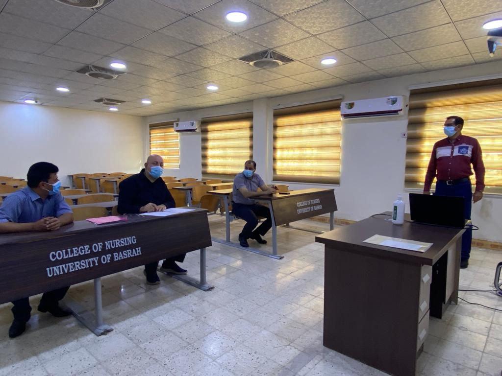 This morning, Sunday, August 15, 2021, the College of Nursing at Basrah University witnessed the conduct of a teaching aptitude test for Dr. Firas Abdel-Qader Jassem, who holds a fellowship certificate from the Arab Council for Health Specializations in the field of family medicine. Prof. Dr. Sajjad Salem Issa chaired the examination committee, in addition to the membership of Assistant Professor Dr. Ahmed Ziyarah Khalaf and lecturer Dr. Husham Hussain Abdul-Ra'aoof. The test was conducted in the Dr. Abdul-Hussain Muhammad Fajr hall in Nursing College building in Bab Al Zubair colleges complex. The examination committee praised the distinguished scientific level of Dr. Firas and the way he presented the lecture with its sobriety and comprehensiveness, wishing him and passing the test successfully, wishing him more success in his scientific and practical life in the service of our dear college and university. |