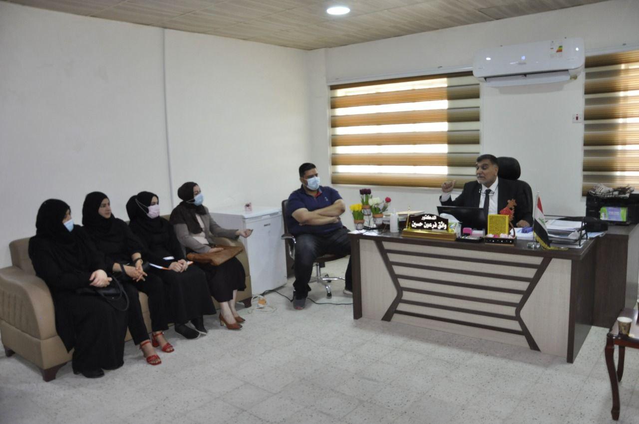 College of Nursing Announcements Alaa Al Husseini Dr. Wathiq Faroun, Head of the Basic Medical Sciences Branch, College of Nursing, Basra University, met with a number of the branch’s teachers. The meeting dealt with several matters, the most important of which were the assignments of the teaching staff to the study materials, the setting of schedules and timings for them, and preparation for the reception of the new academic year, as well as identifying the most prominent obstacles facing the teaching staff in light of the method of e-learning, in-person lectures and practical lessons, as well as the special problems of students and the special needs of the branch. Faroun emphasize overcoming all the difficulties and problems facing the students and solving them in order to reach a sober education in the service of the scientific process. |