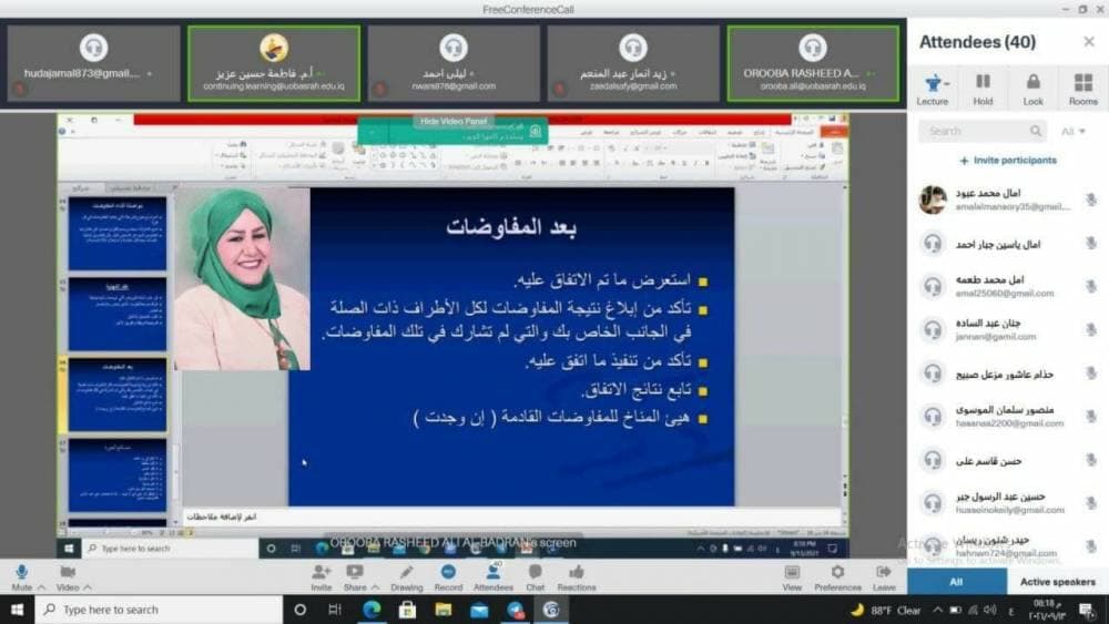 The Continuing Education and Development Center at the University of Basrah organized an online lecture on the management of negotiation skills and bargaining within the Rasana project.