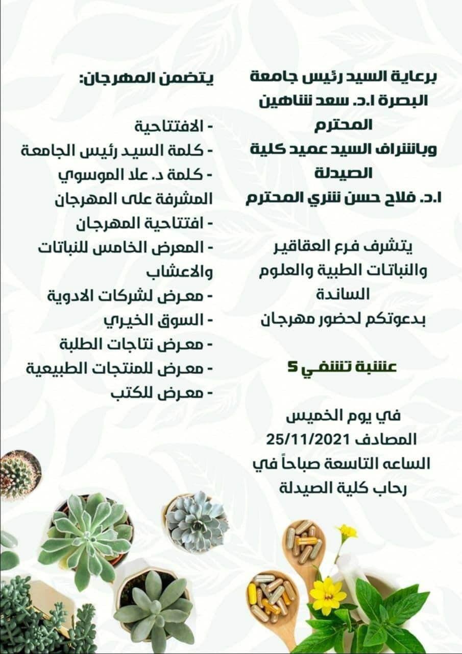 The College of Pharmacy at the University of Basrah is preparing to hold the annual festival (Healing Herb) on Thursday 25/11/2021 at nine A.M.