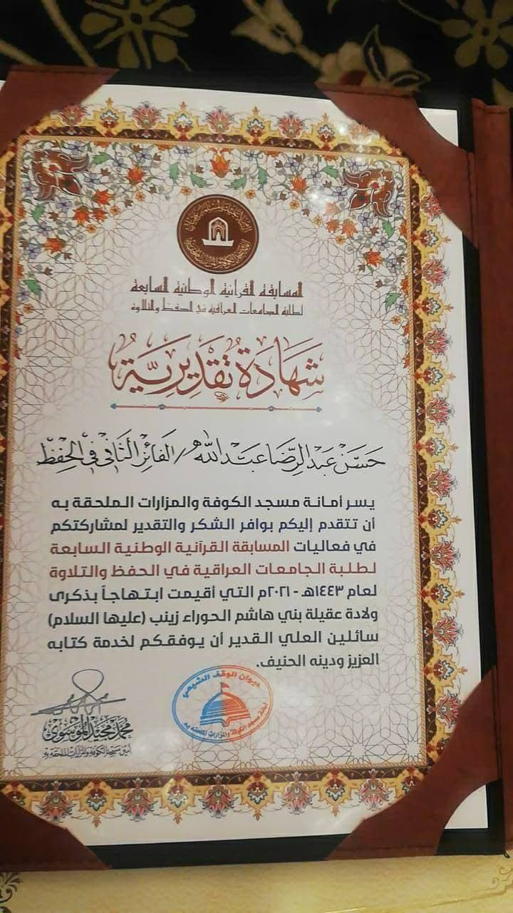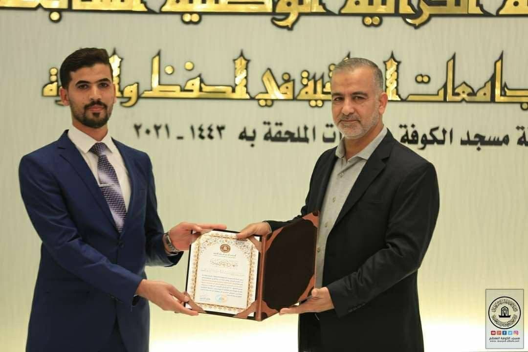 The results showed that the University of Basrah ranked second in the memorization of the Qur’an section by the reciter Hassan Abdul-Ridha from the College of Dentistry, and in the recitation Hussein Ismail Nimr. As they competed with the universities of Iraq in memorization and recitation in the Qur’anic competition in the Kufa Mosque.