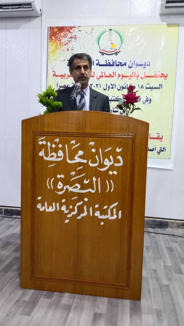 The President of Basrah University, Dr. Saad Shaheen Hammadi, the Dean of the College of Arts, and the Dean of the College of Education for Women, participated in the celebration of the International Day of the Arabic Language, which was held by the Basra Governorate Office in the Central Public Library, in the presence of several intellectuals, writers, and public and official figures.
