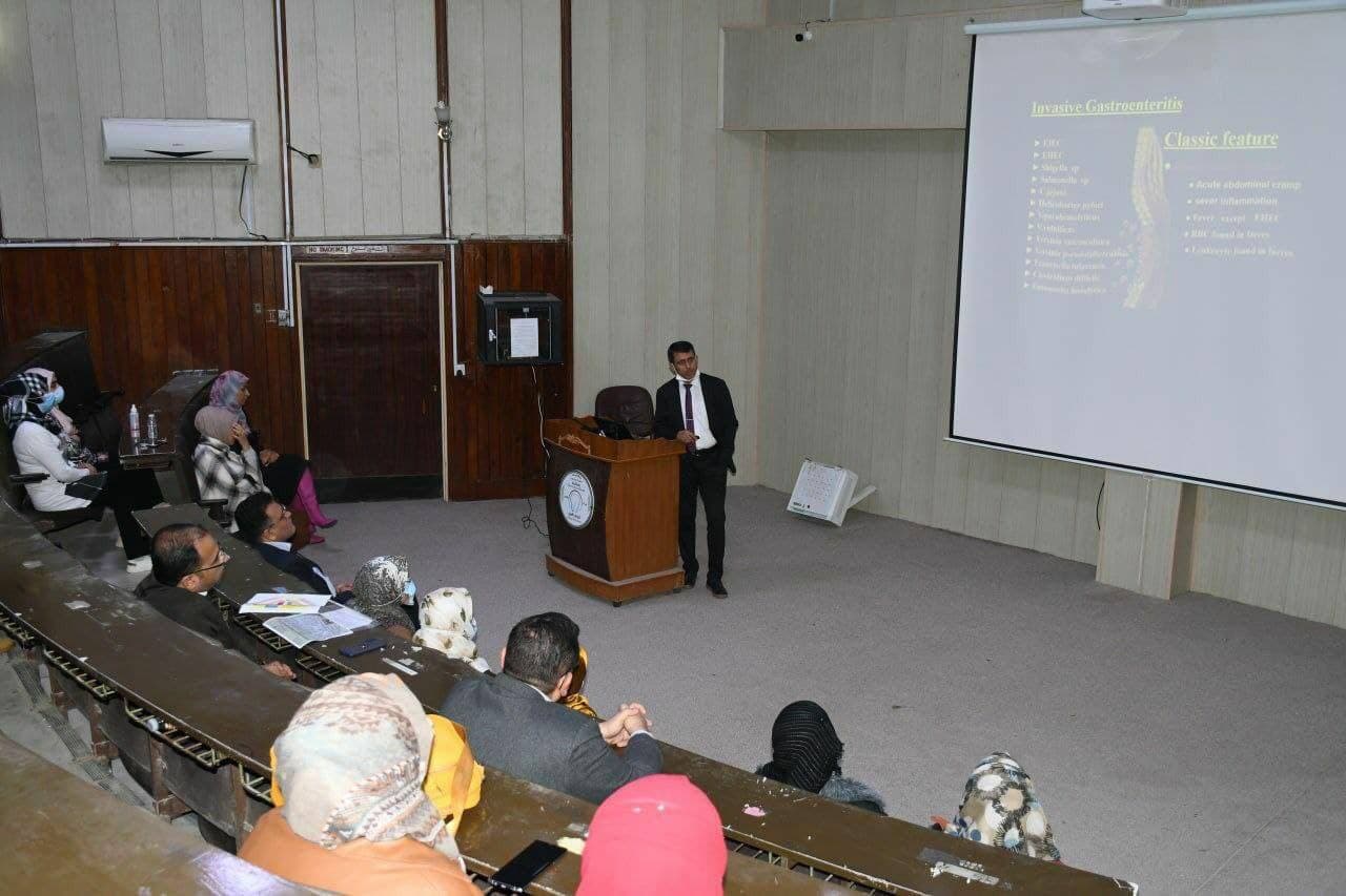 The lecture, which was presented by Dr. Salman Sahib Atshan, included several topics, dealing with gastrointestinal infections, cases of food toxicity, and the causes that lead to food contamination with stomach acid and heat resistant bacterial toxins.