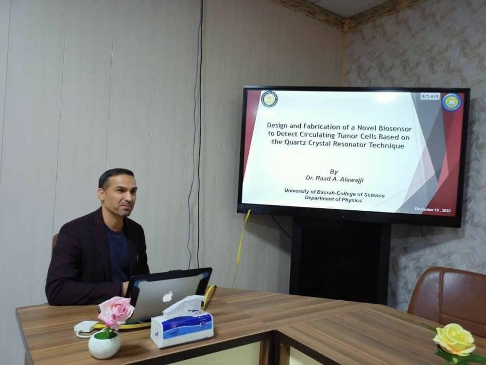 The College of Science at the University of Basrah organized a scientific lecture on the design and manufacture of a biosensor using a quartz resonant crystal to detect mobile cancer cells (CTC).